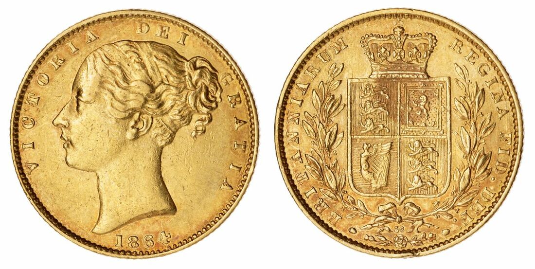 (g) Victoria (1837-1901), 'Shieldback' Sovereign, 1864 'Stub-top 4' [Die 56], second larger young head,