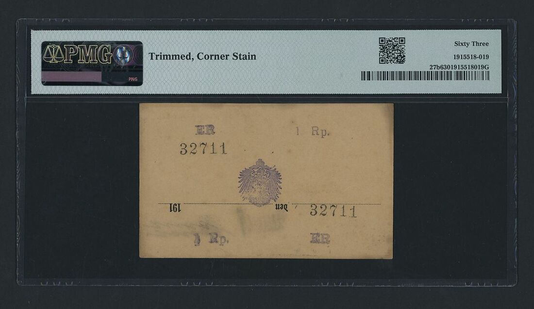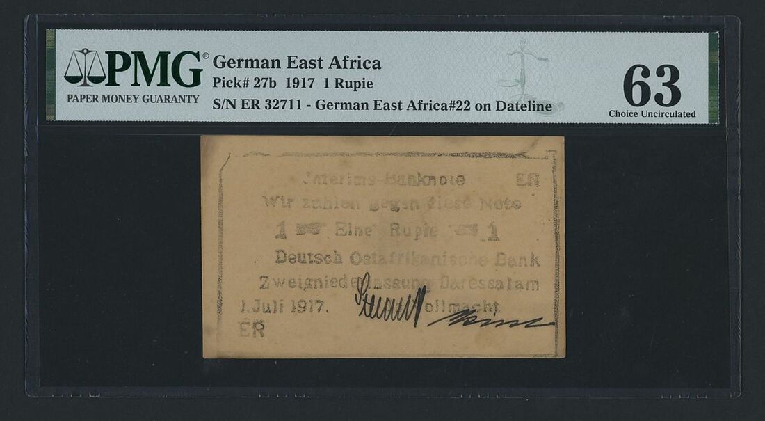 Deutsch-Ostafrikanische Bank, German East Africa, [Inverted Letterhead] 1 Rupie, 1917, serial number ER 32711, (Pick 27b), in PMG holder 63 Choice Uncirculated, trimmed, corner stain, with inverted date line overprint, rare