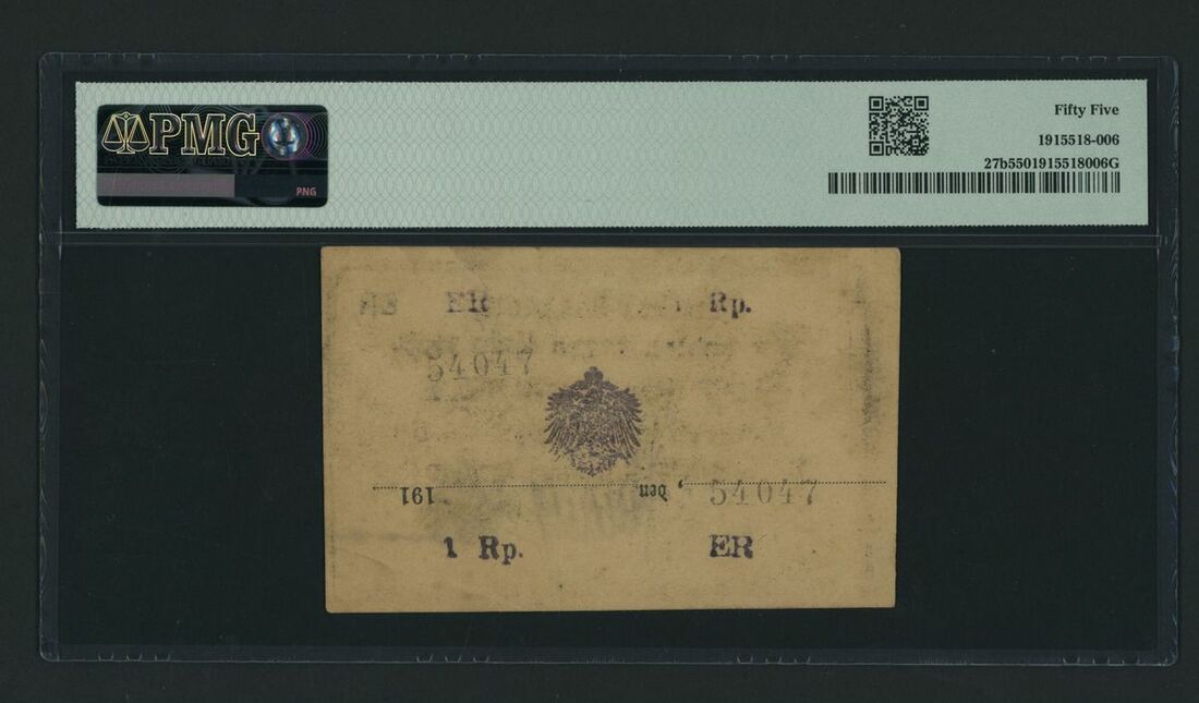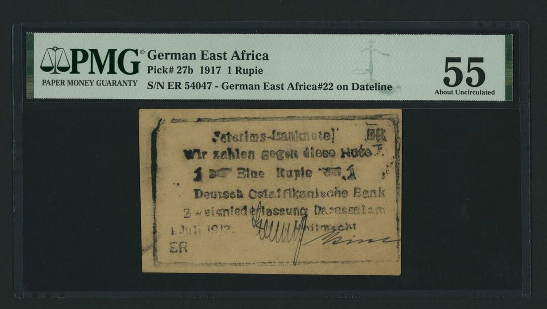Deutsch-Ostafrikanische Bank, German East Africa, [Inverted Letterhead] 1 Rupie, 1917, serial number ER 54047, (Pick 27b), in PMG holder 55 About Uncirculated, with inverted date line overprint, scarce