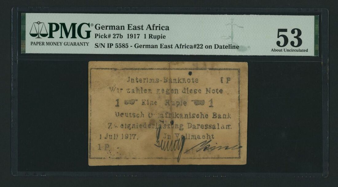 Deutsch-Ostafrikanische Bank, German East Africa, [Letterhead] 1 Rupie, 1917, serial number IP 5585, (Pick 27b), in PMG holder 53 About Uncirculated, stains, minor ink burn, with date line overprint, scarce