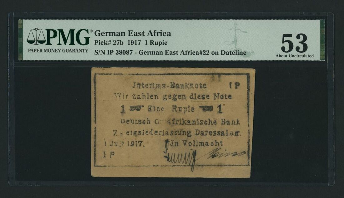 Deutsch-Ostafrikanische Bank, German East Africa, [Letterhead] 1 Rupie, 1917, serial number IP 38087, (Pick 27b), in PMG holder 53 About Uncirculated, with date line overprint, scarce