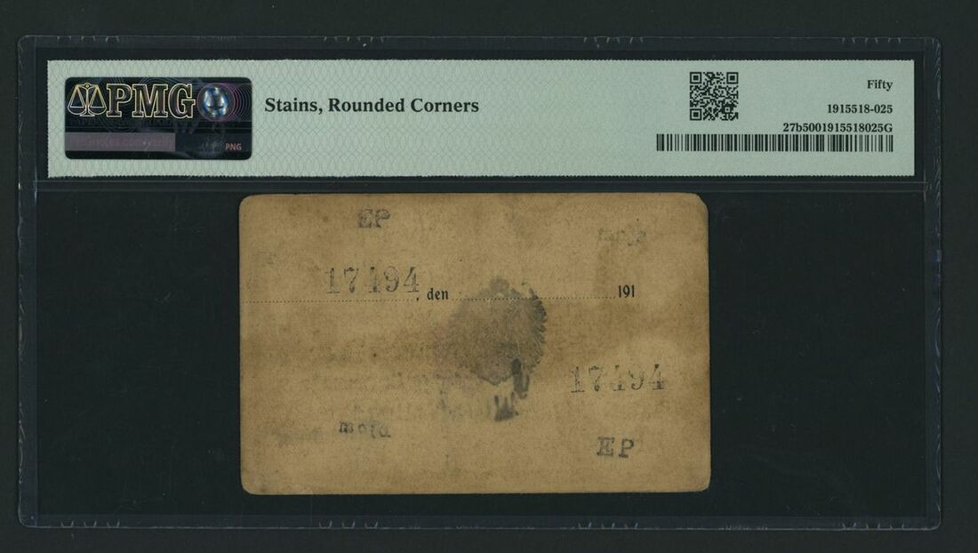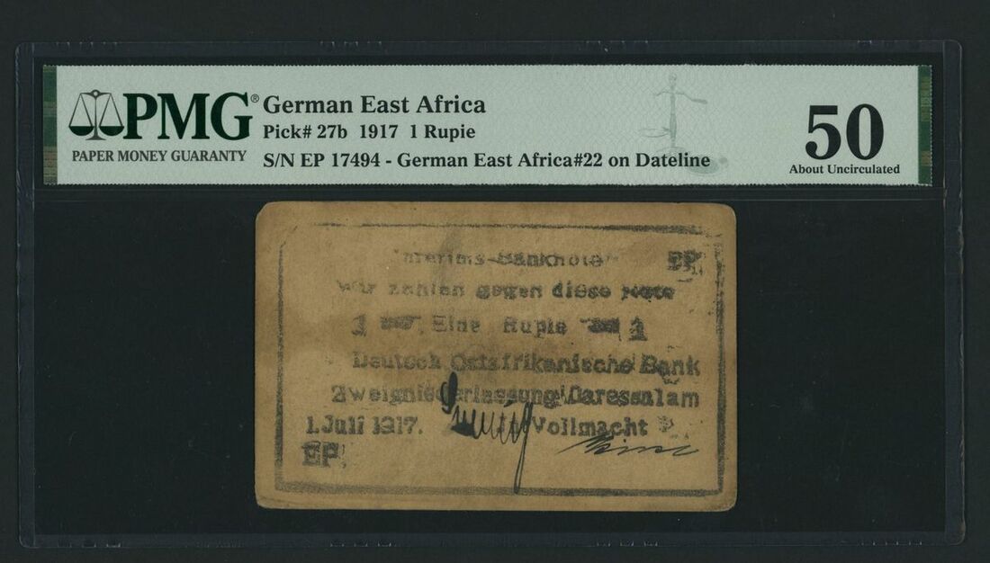 Deutsch-Ostafrikanische Bank, German East Africa, 1 Rupie, 1917, serial number EP 17494, (Pick 27B), in PMG holder 50 About Uncirculated, stains, rounded corners, with date line overprint, scarce