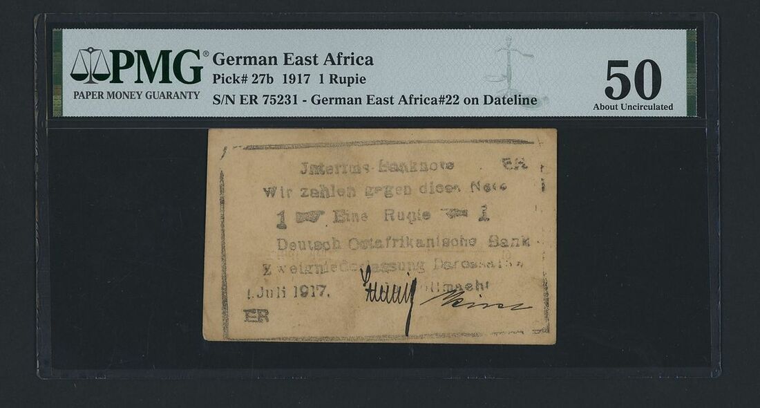 Deutsch-Ostafrikanische Bank, German East Africa, [Inverted Letterhead] 1 Rupie, 1917, serial number ER 75231, (Pick 27b), in PMG holder 50 About Uncirculated, with inverted date line overprint, scarce