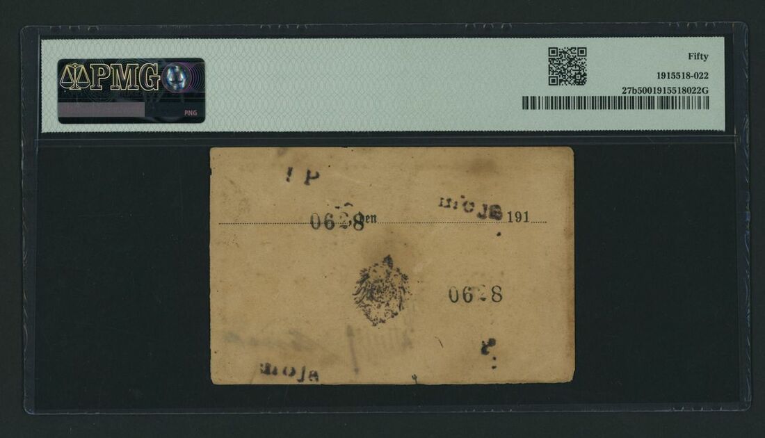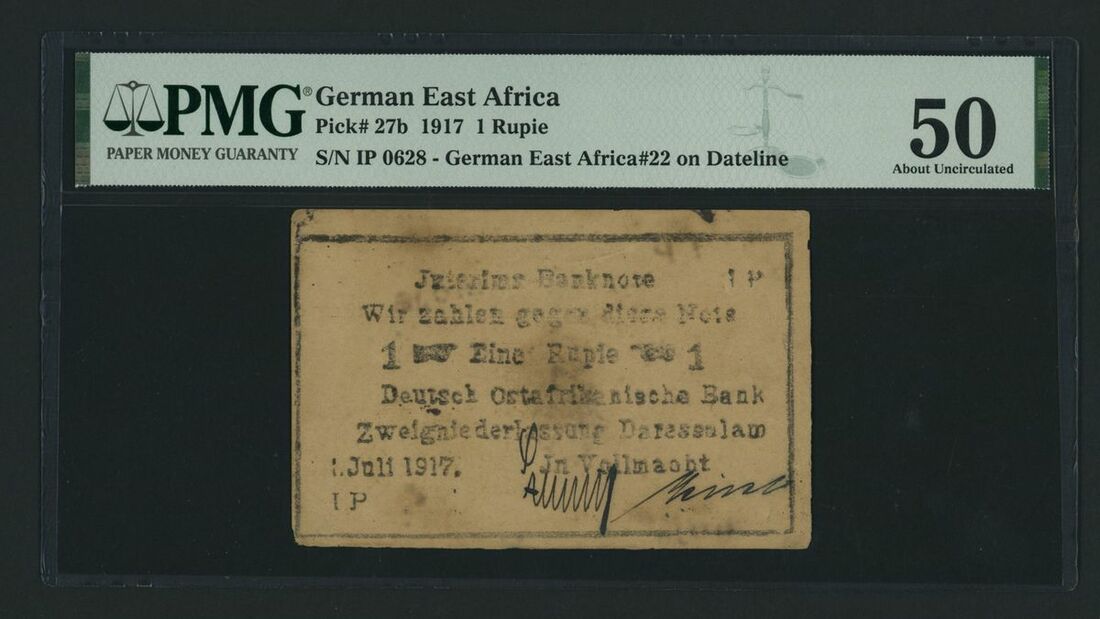 Deutsch-Ostafrikanische Bank, German East Africa, [Letterhead] 1 Rupie, 1917, serial number IP 0628, (Pick 27b), in PMG holder 50 About Uncirculated, with date line overprint, scarce