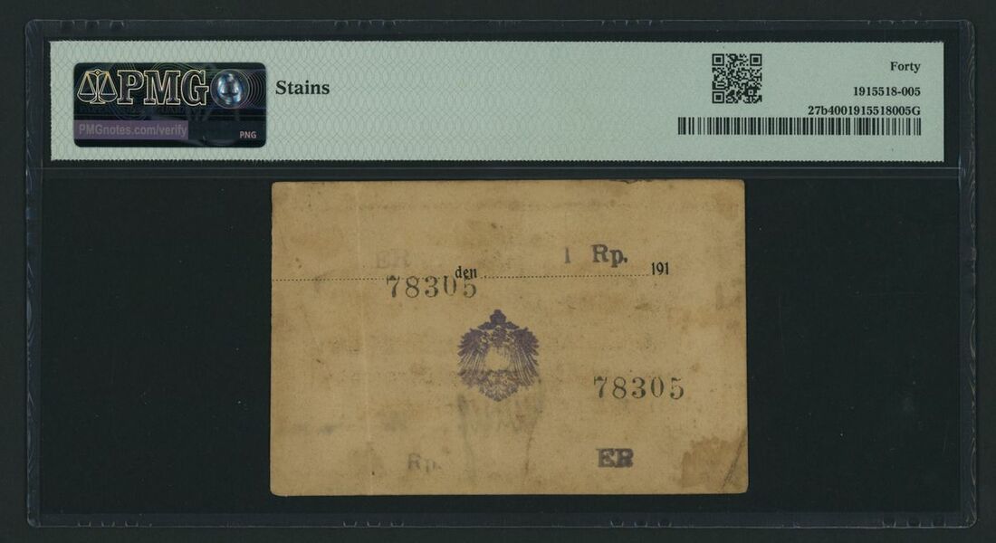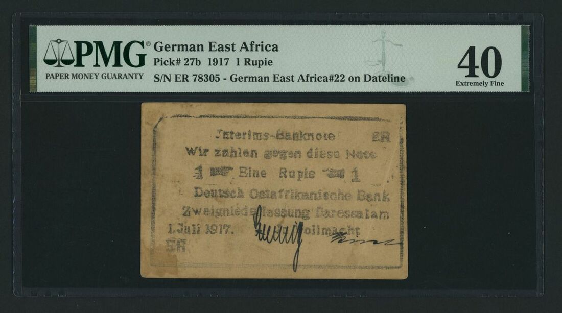 Deutsch-Ostafrikanische Bank, German East Africa, [Letterhead] 1 Rupie, 1917, serial number ER 78305, (Pick 27b), in PMG holder 40 Extremely Fine, stains, with date line overprint, scarce