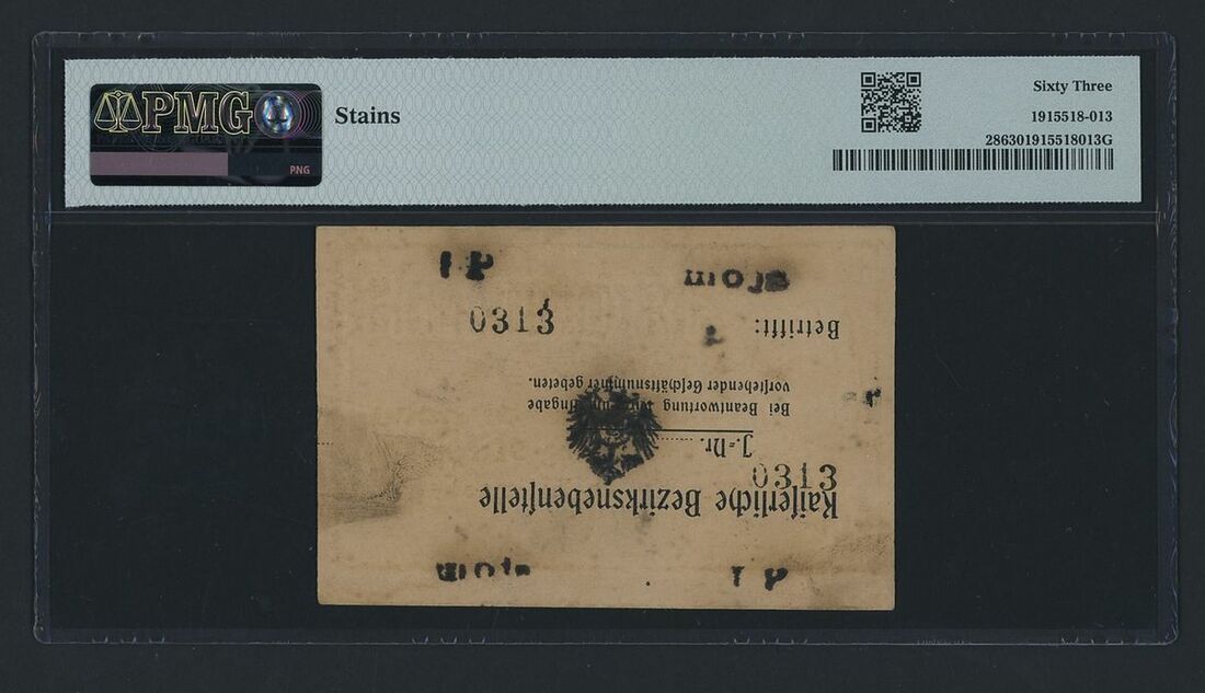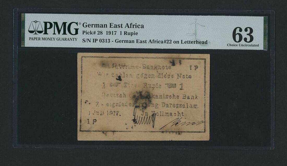 Deutsch-Ostafrikanische Bank, German East Africa, [Inverted Letterhead] 1 Rupie, 1917, serial number IP 0313, (Pick 28), in PMG holder 63 Choice Uncirculated, stains, with inverted letterhead overprint, scarce