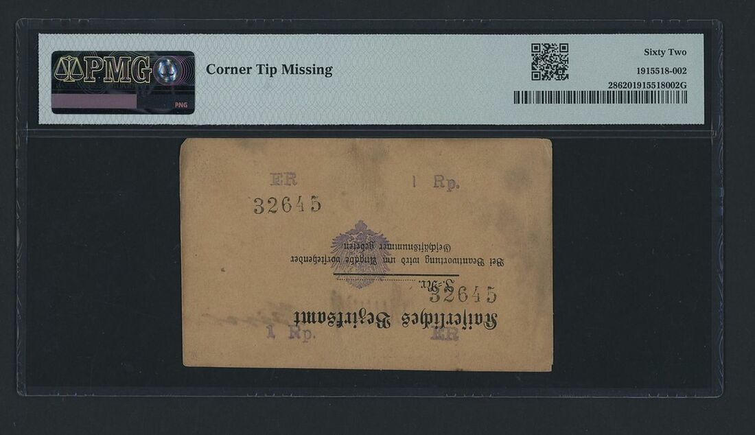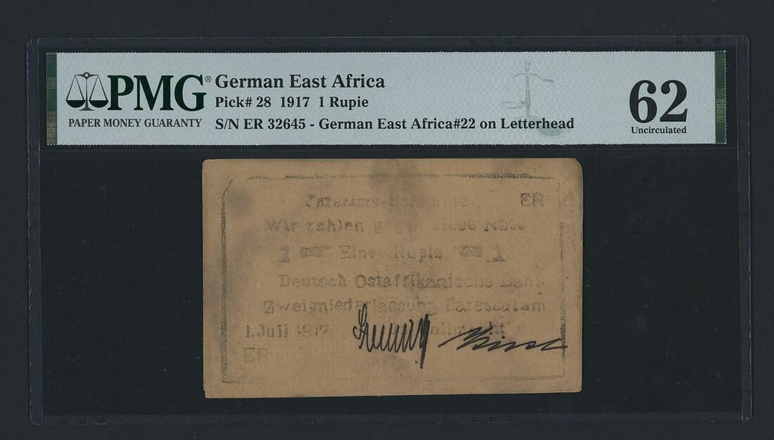 Deutsch-Ostafrikanische Bank, German East Africa, [Inverted Letterhead] 1 Rupie, 1917, serial number ER 32645, (Pick 28), in PMG holder 62 Uncirculated, corner tip missing, with inverted letterhead overprint, scarce