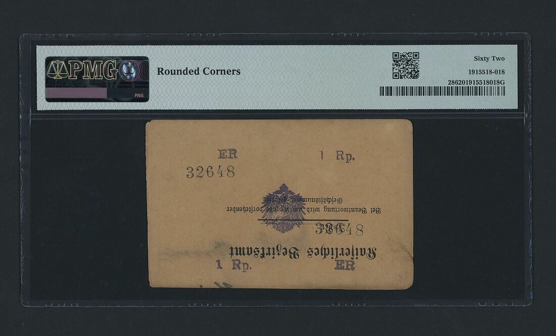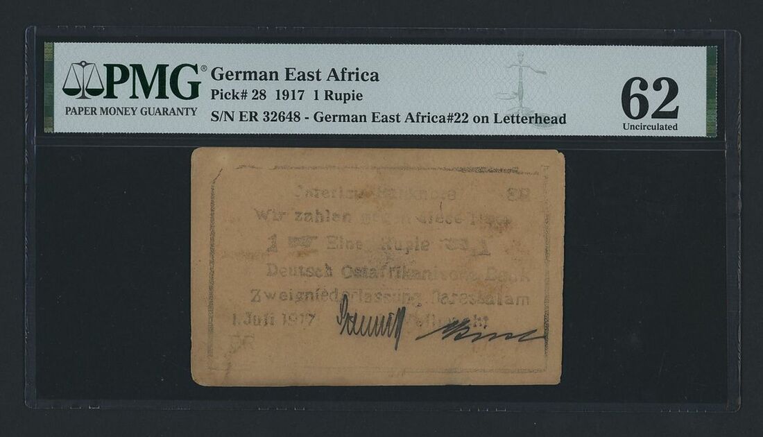 Deutsch-Ostafrikanische Bank, German East Africa, [Inverted Letterhead] 1 Rupie, 1917, serial number ER 32648, (Pick 28), in PMG holder 62 Uncirculated, rounded corners, with inverted letterhead overprint, rare