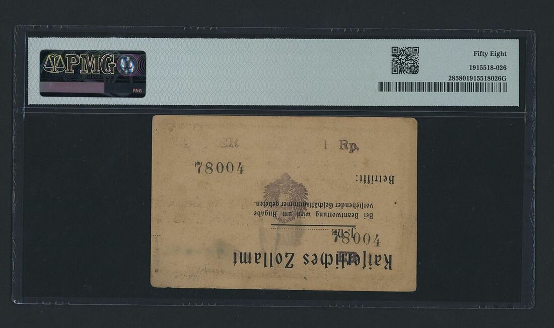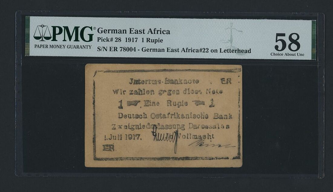 Deutsch-Ostafrikanische Bank, German East Africa, [Inverted Letterhead] 1 Rupie, 1917, serial number ER 78004, (Pick 28), in PMG holder 58 Choice About Uncirculated, with inverted letterhead overprint