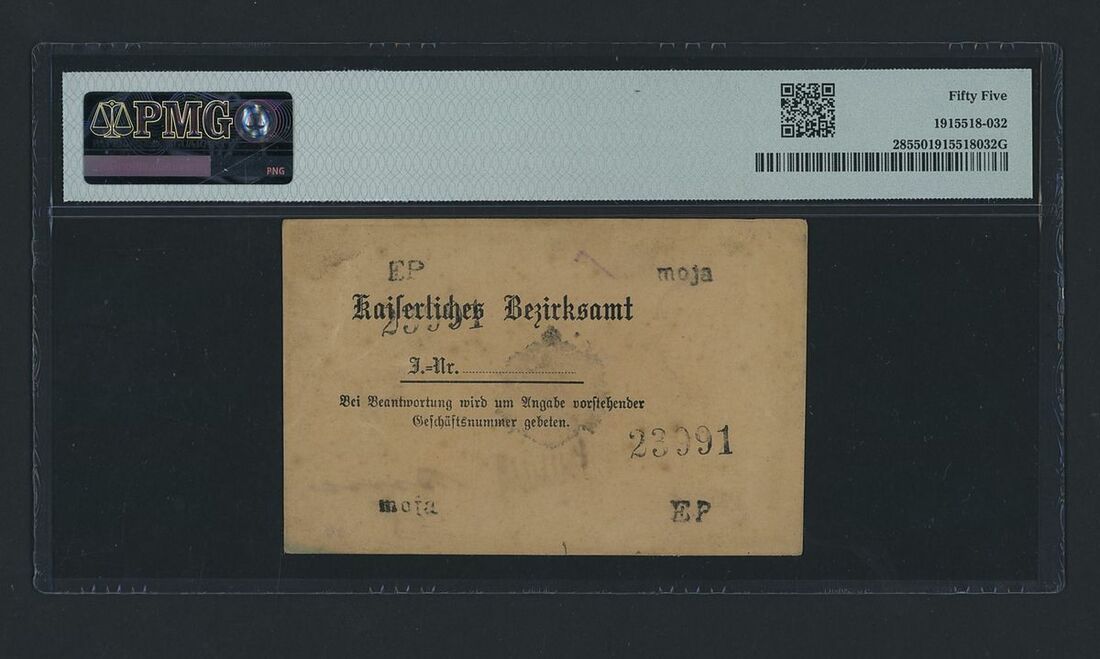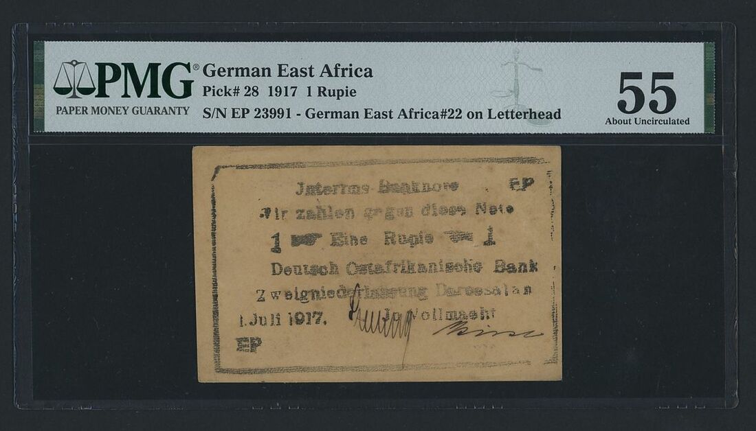 Deutsch-Ostafrikanische Bank, German East Africa, [Letterhead] 1 Rupie, 1917, serial number EP 23991, (Pick 28), in PMG holder 55 About Uncirculated, with letterhead overprint, scarce