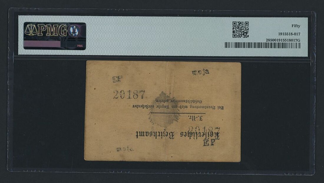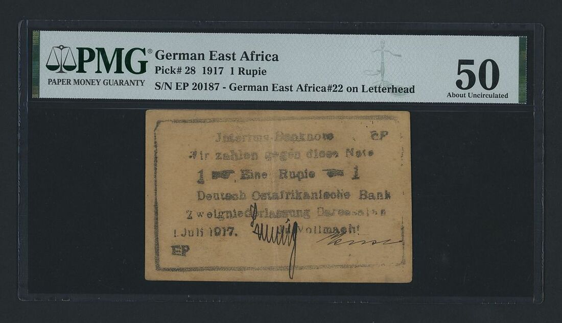 Deutsch-Ostafrikanische Bank, German East Africa, [Inverted Letterhead] 1 Rupie, 1917, serial number EP 20187, (Pick 28), in PMG holder 50 About Uncirculated, with inverted letterhead overprint