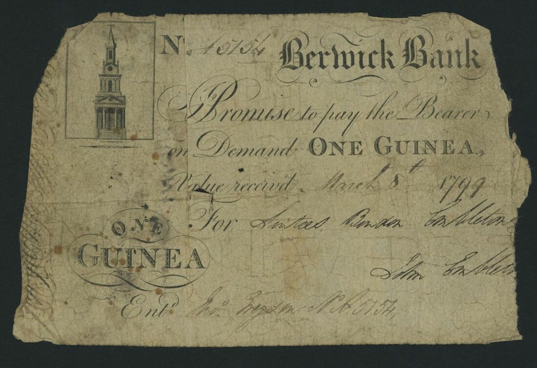 Berwick Bank, 1 Guinea, 8th (?) March 1799, serial number 15154 (?), handsigned by Surtees, Burton and Embleton, hand stamped and further hand writing on reverse