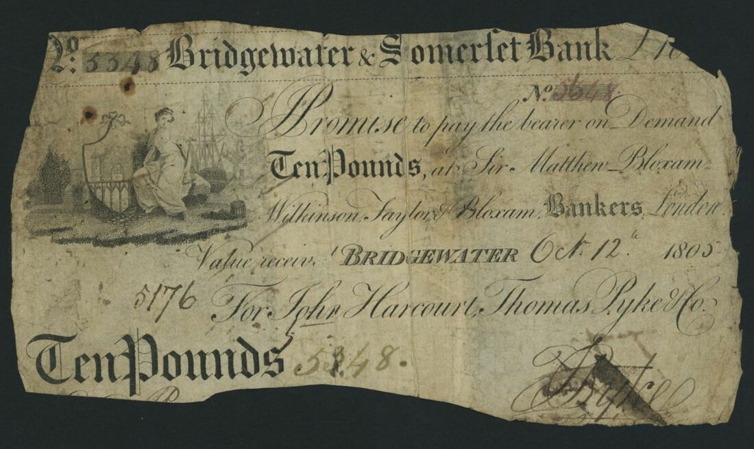 Bridgewater & Somerset Bank (John Harcourt, Thomas Pyke & Co.), £10, 12th October 1805, serial number 5348, (Outing 281h), halved and re-joined, small holes, rust at top left, about very good, rare