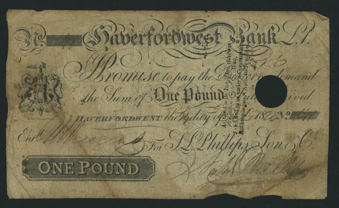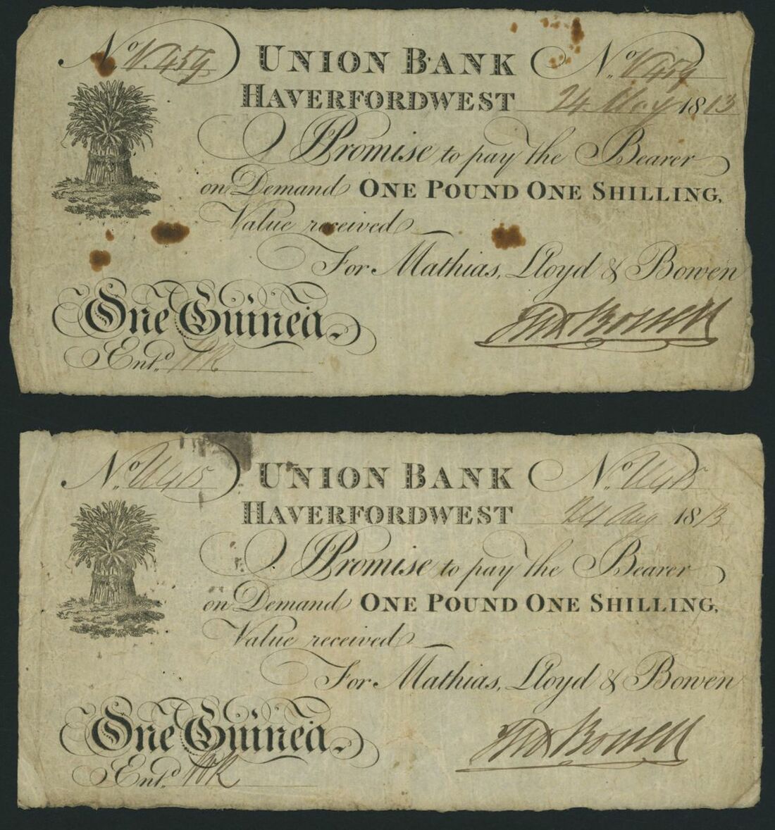 Haverfordwest Bank, Haverfordwest Union Bank, [3 notes] £1, 1 Guinea, 1813-20, all notes are hand signed, Haverfordwest Bank note 24th October 1920, serial number 141; Haverfordwest Union Bank notes 24th May 1913 and 24th August 1813 respectively, serial numbers N.454 (?) and U415