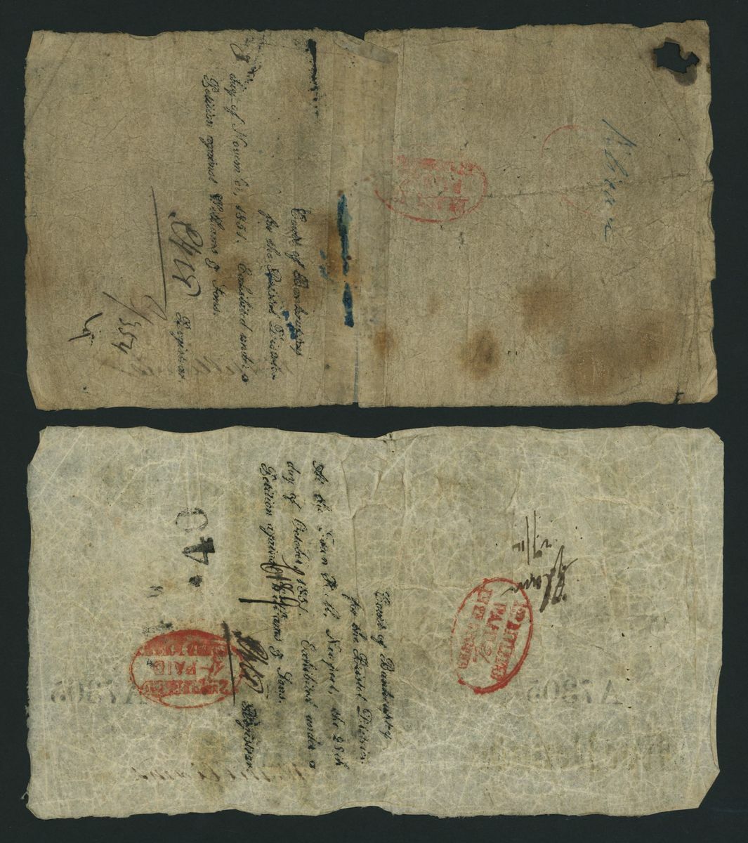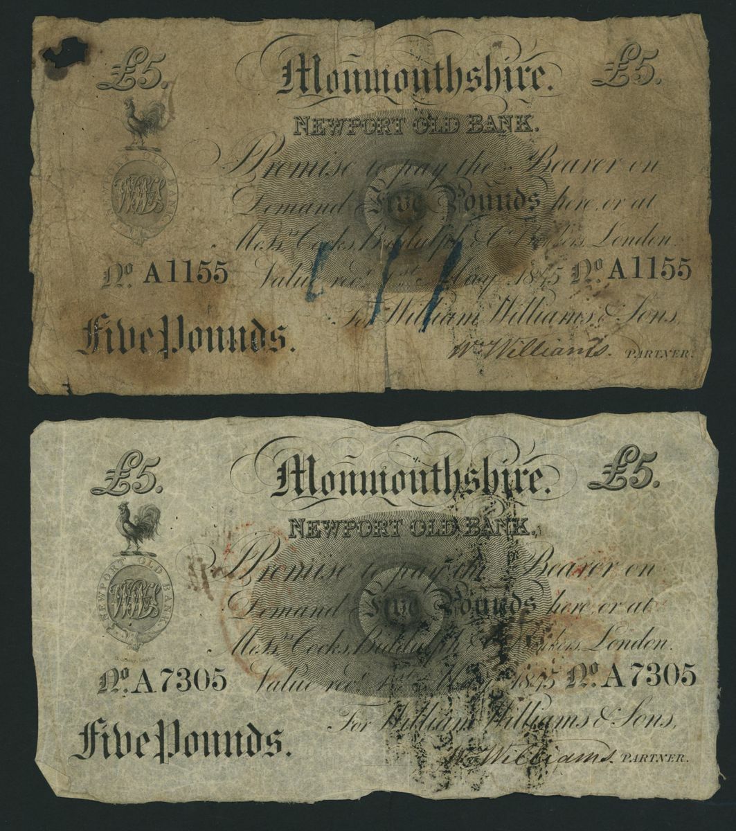 Monmouthshire, Newport Old Bank, [2 notes] £5, 1st May 1845, serial numbers A1155 and A7305, both notes are handsigned, additional writing and stamps are on the reverse of both notes