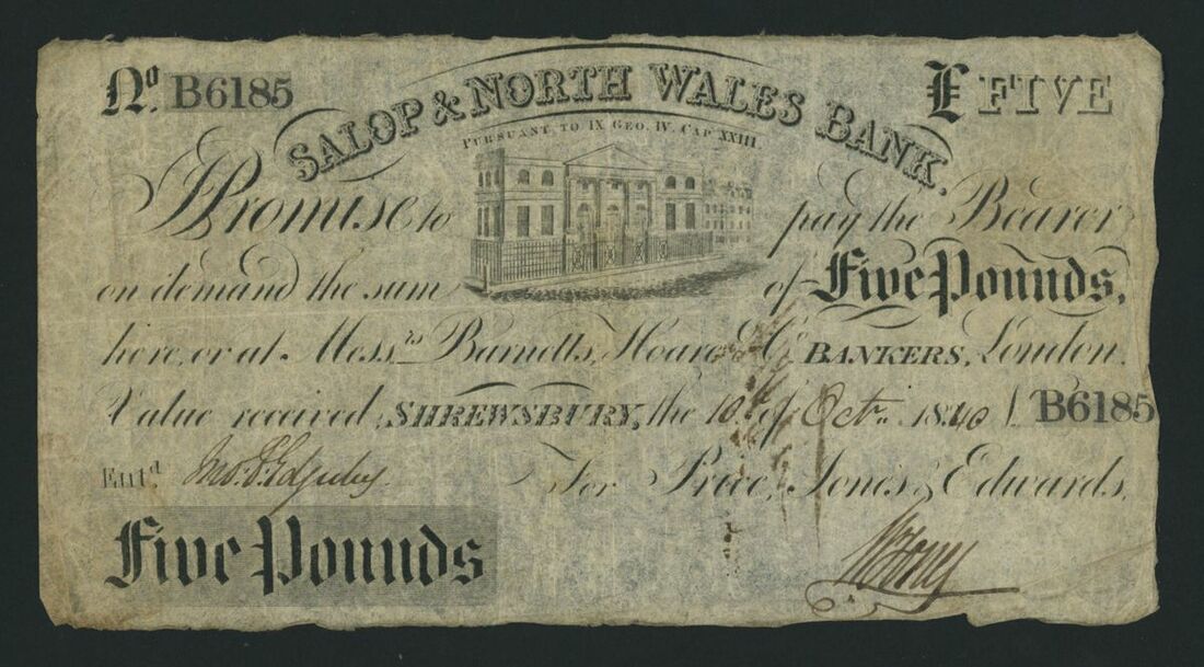 Salop and North Wales Bank, £5, Shrewsbury, 10th October 1840, B6185, (Outing 1962b), fine