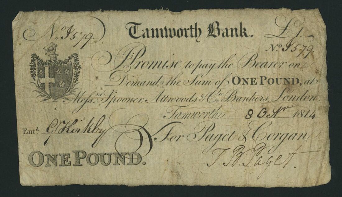 Tamworth Bank, [2 notes] £1, £5, 1813-14, £1, 8th October 1814, serial number I579 (?); £5, 30th October 1813, serial number F1210 (?)