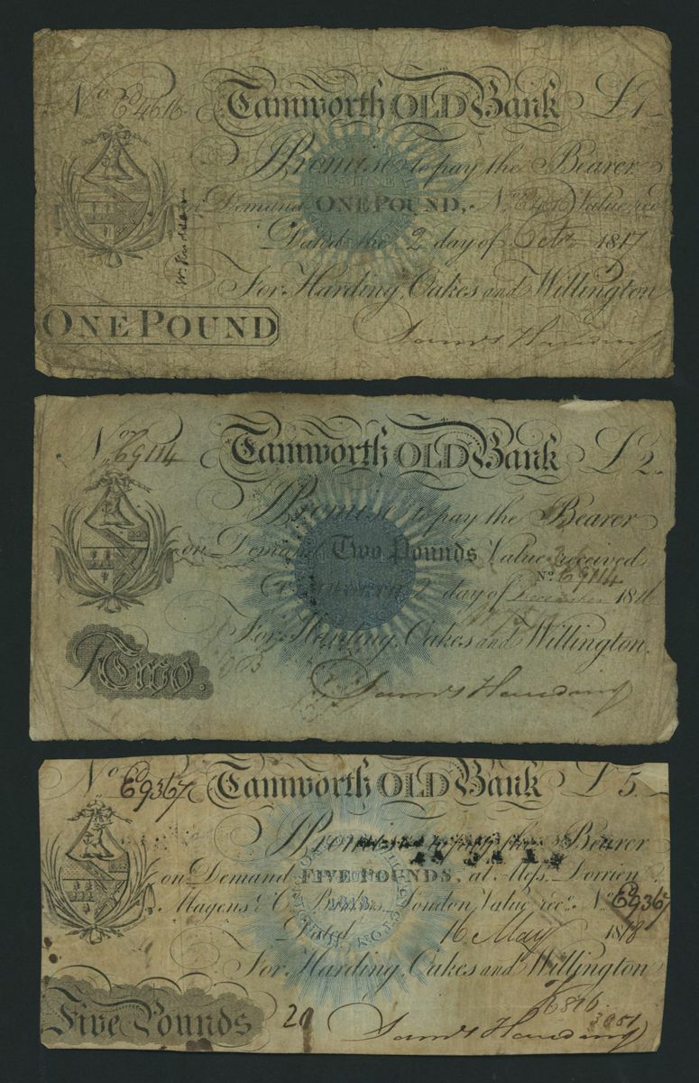 Tamworth Old Bank, [3 notes] £1, £2, £5, 1816-1818, £1, 2nd October 1817, serial number E4616; £2, 2nd December 1816, serial number C9114 (?); £5, 16th May 1818, serial number E 9367