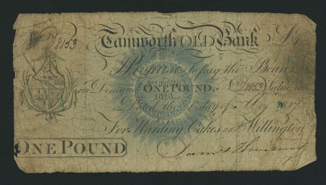 Tamworth Old Bank, £1, 1st (?) May 1817, serial number D8153, spectacular and vivid colour for such a note