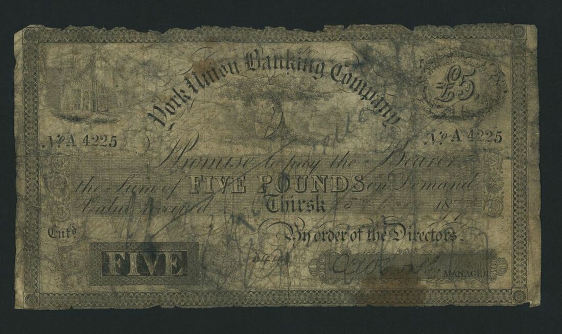 York Union Banking Company, £5, Thirsk, 25th October 1877, serial number A 4225, (Outing 2167a), handwritten 'Cancelled' across obverse, fair, scarce