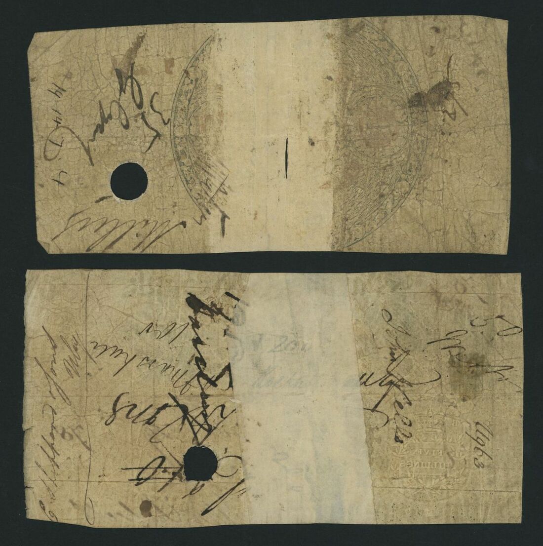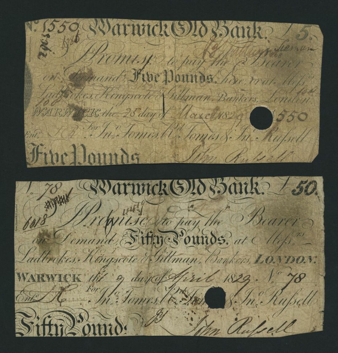 Warwick Old Bank, [2 notes] £5, £50, 1829, £5, 25th May 1829, serial number 1550; £50, 9th April 1829, serial number 78