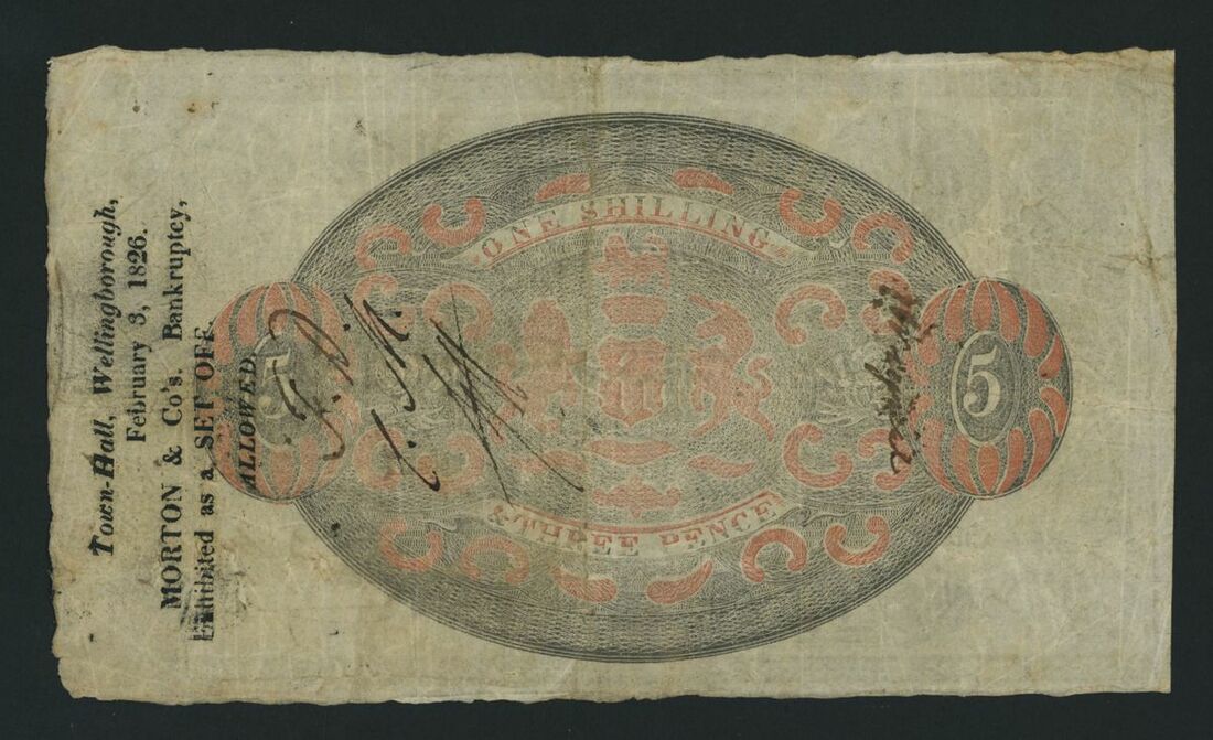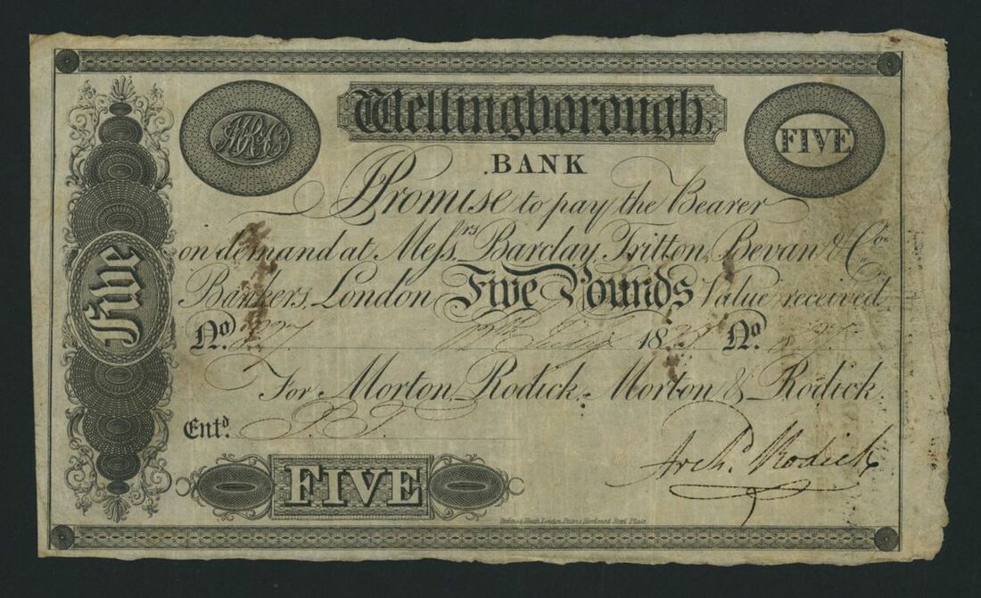 Wellingborough Bank, £5, 12th July 1825 (?), serial number 827 (?), (Outing 2294f), good fine