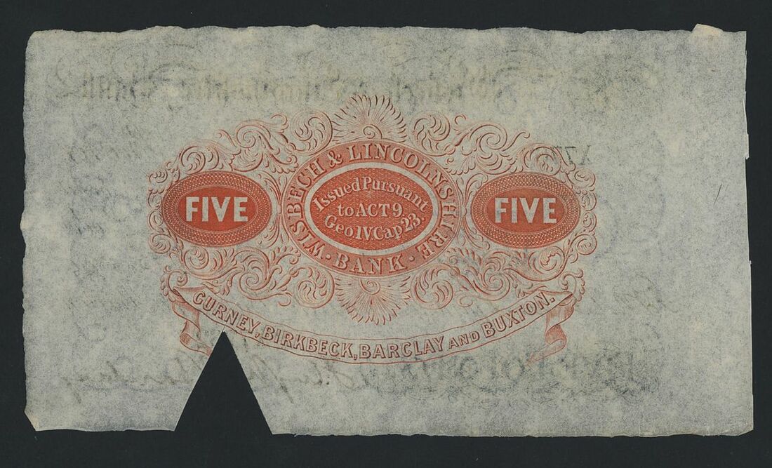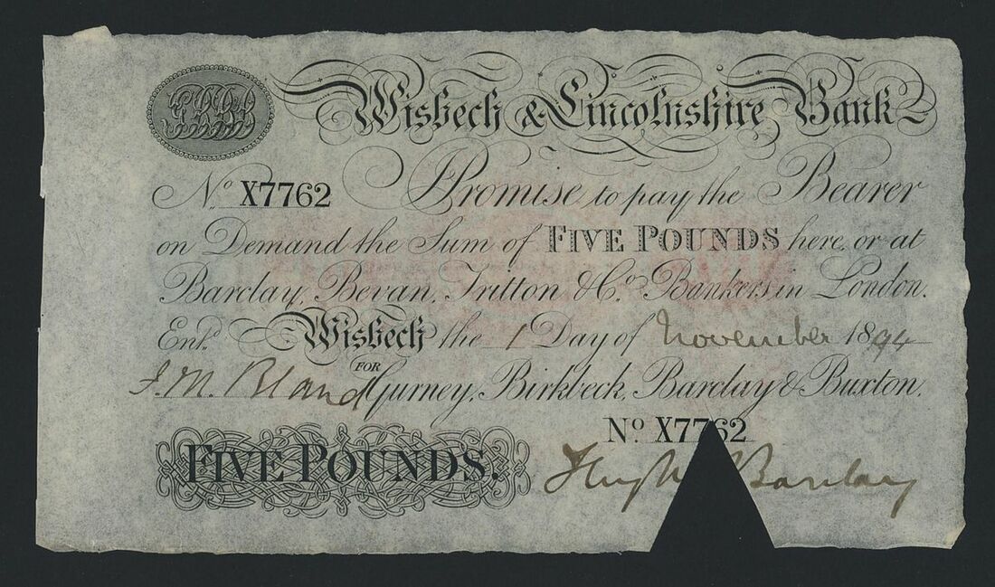 Wisbech and Lincolnshire Bank, £5, Wisbech, 1st November 1894, serial number X7762, colourful reverse, mentioning Gurney, Birkbeck, Barclay and Buxton, obverse signature: Hugh Barclay. Cancelled cut out of the bottom right edge. Extremely good condition for such a note