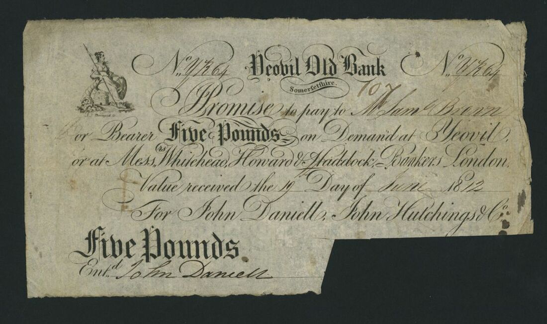 Yeovil Old Bank (John Daniell, John Hutching & Co.), cut cancelled £5, 19th June 1812, serial number YR64, (Outing 2443k), fine