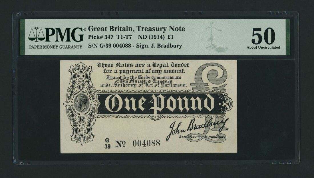 Treasury, £1, ND (1914), serial number G/39 004088, J. Bradbury signature, uniface