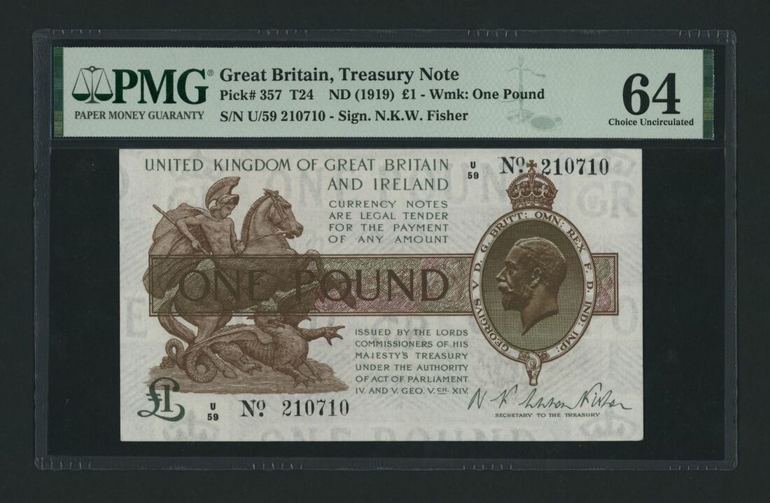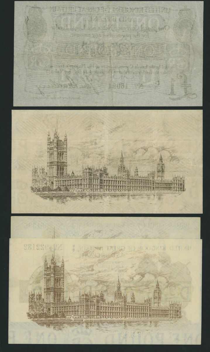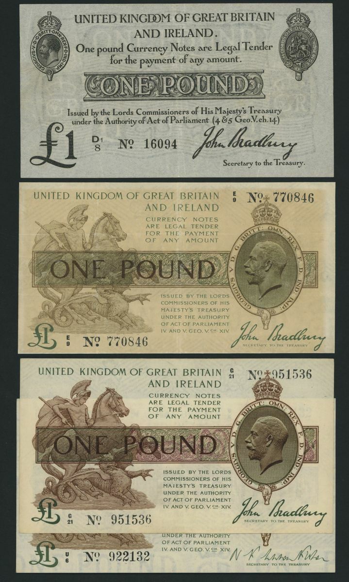 Treasury, [5 notes] £1, 1914-1919, J. Bradbury and N. F. W. Fisher signatures, serial numbers D1/8 16094, E/9 770846, G/21 951536 (J. Bradbury); U/6 922132, U/59 210710
