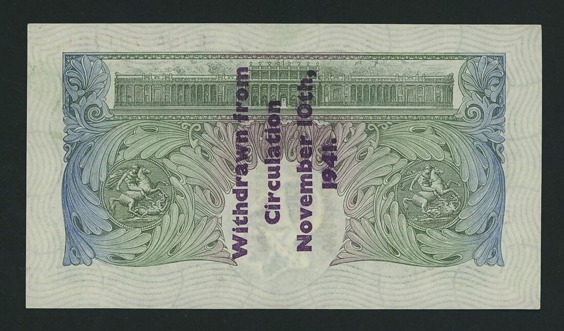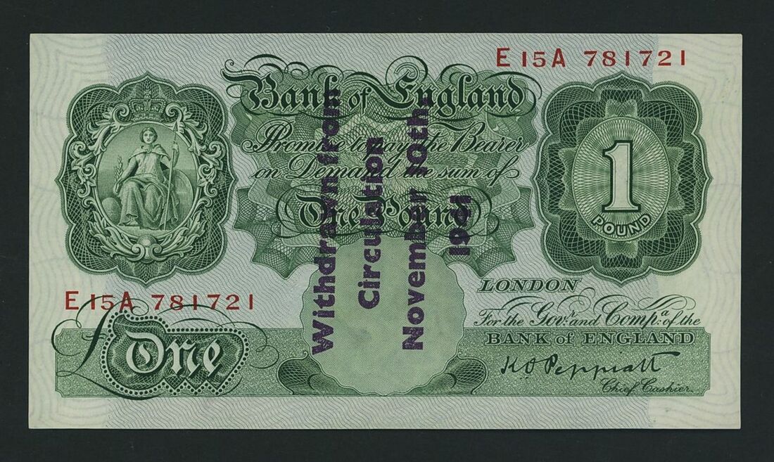 Bank of England, States of Guernsey Overprint, £1, London, ND (1934), serial number E15A 781721, K. O. Peppiatt signature, "Withdrawn from Circulation November 10th 1941"