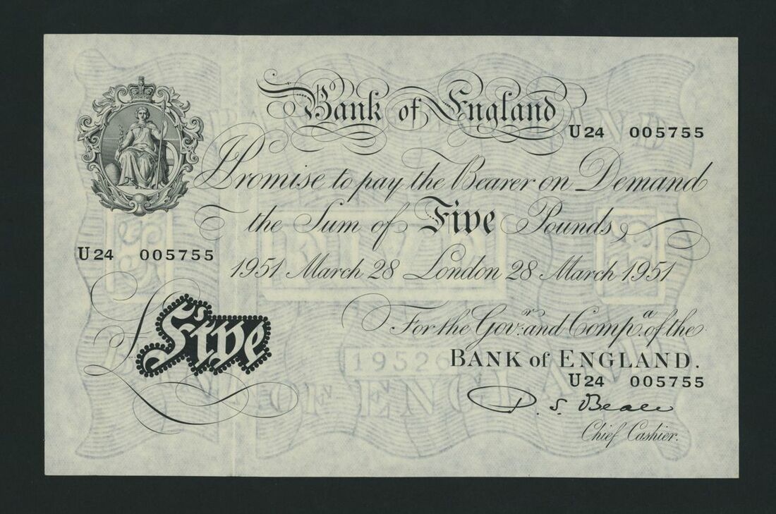 Bank of England, White Note, £5, 28th March 1951, serial number U24 005755, P. S. Beale signature, (Pick 344, EPM B270), extremely fine, interesting number