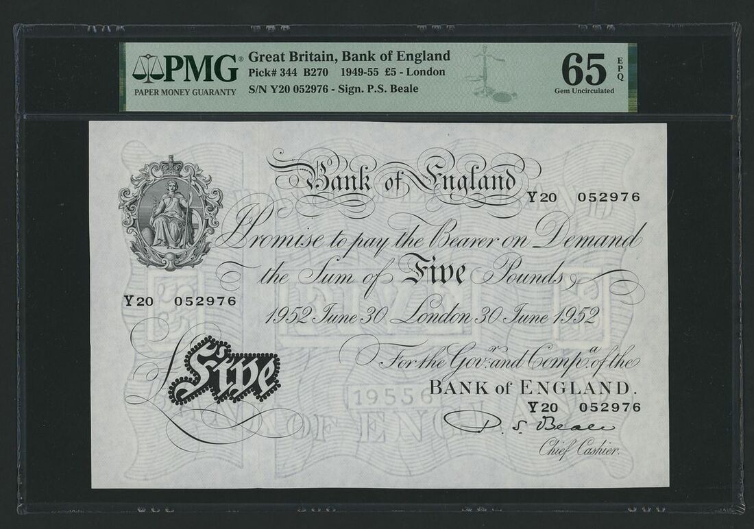 Bank of England, £5, London, 30th June 1952, serial number Y20 052976, P. S. Beale signature, (Pick 344, BNB 177, EPM 270), in PMG holder 65 EPQ Gem Uncirculated