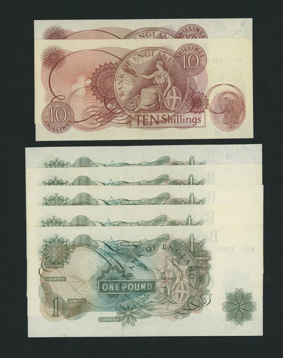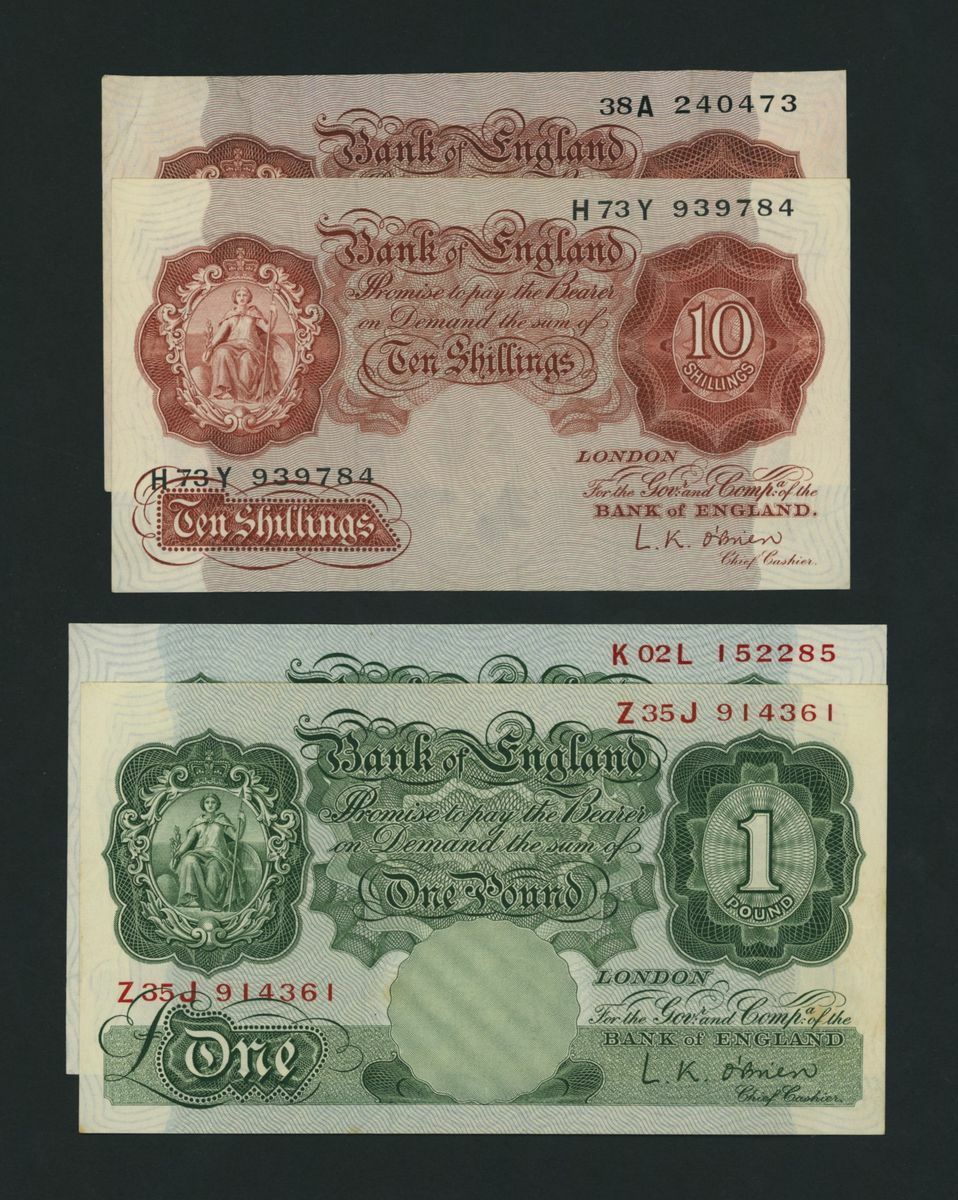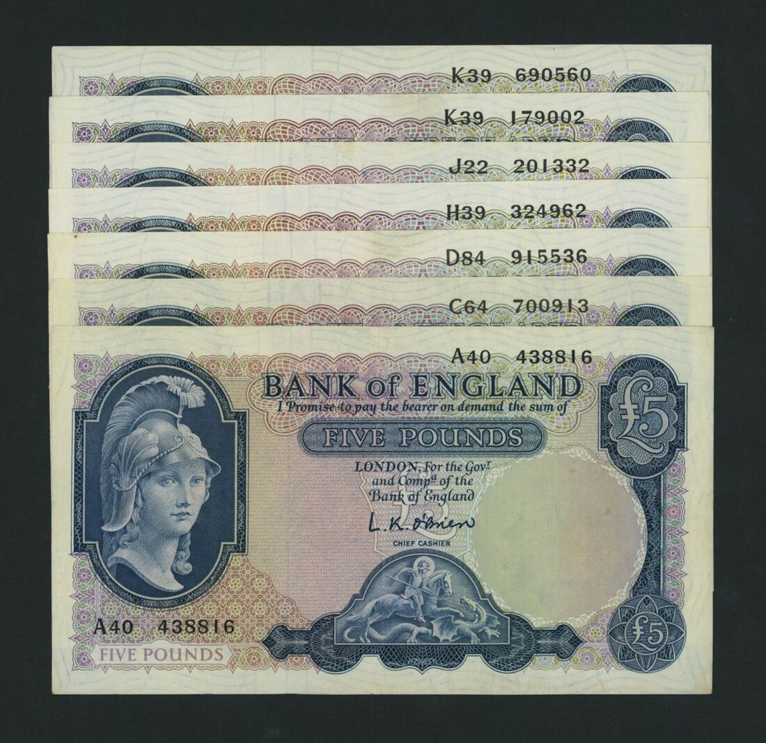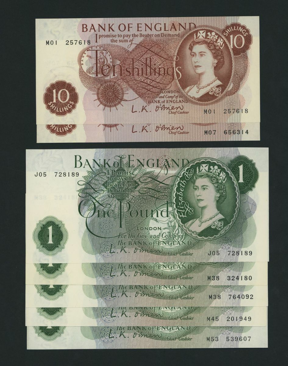 Bank of England, [18 notes] 10 Shillings, £1, £5, 1955-61, L. K. O'Brien signature, (Pick 368c, 369c, 371a, 372a, 373a, 374a, EPM B271, 272, 273, 277, 280, 287, 281, 285), extremely fine to uncirculated (18 notes)