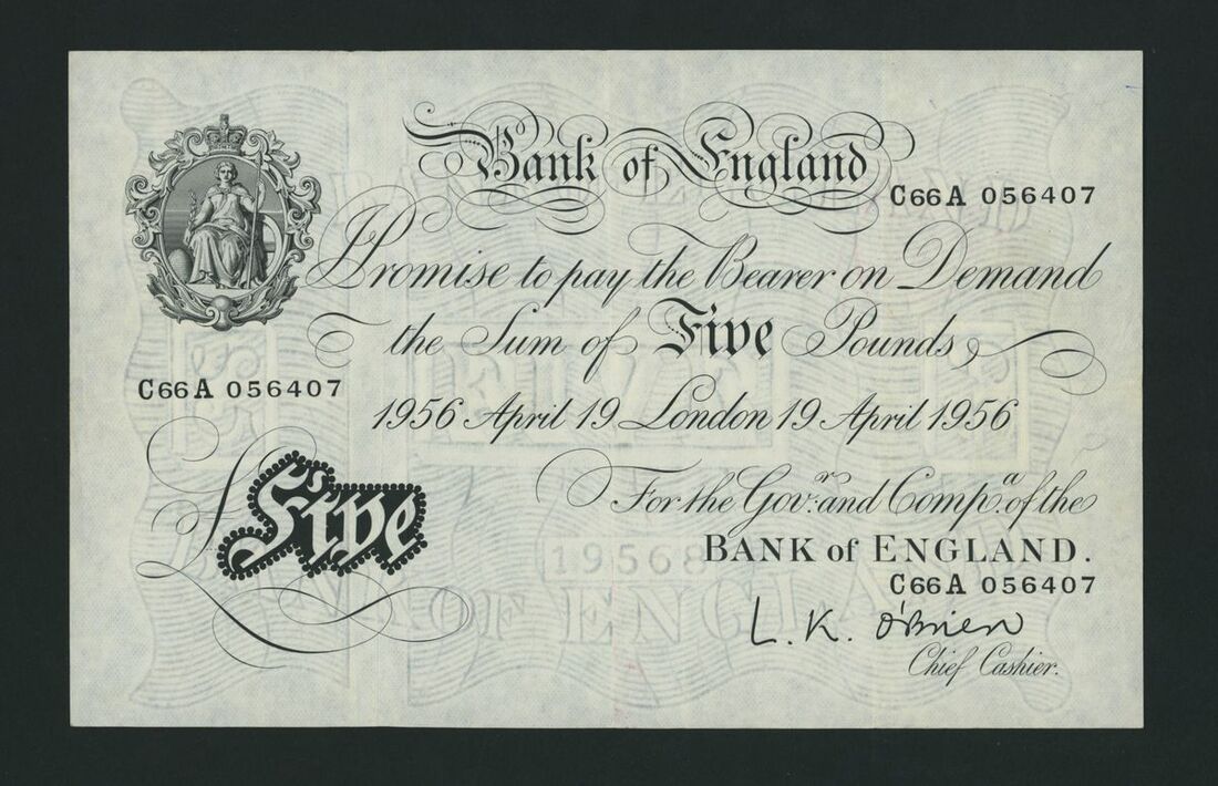 Bank of England, White Note, £5, London, 19th April 1956, serial number C66A 056407, (Pick 345, EPM B276), good very fine, some creasing, contemporary stamp ink