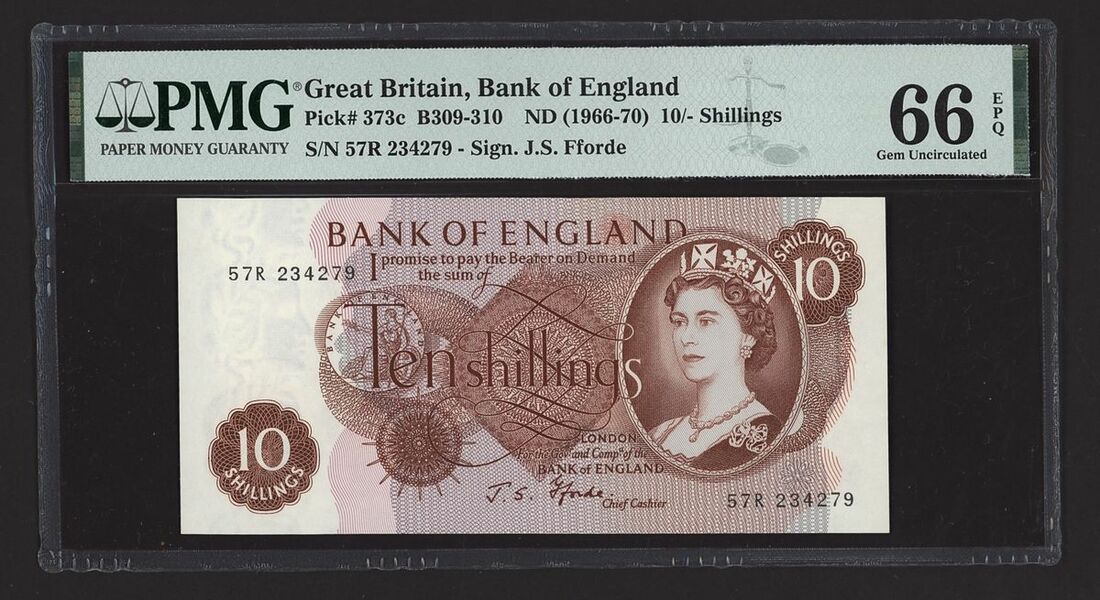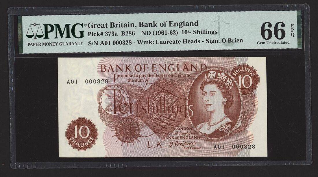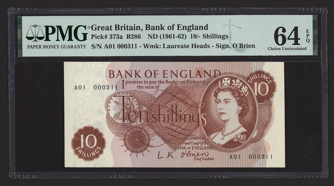 Bank of England, [3 notes] 10 Shillings, 1961-67, two first run O'Brien 10 Shilling notes, serial numbers A01 000311 and A01 000382, and one Fforde 10 Shilling first series note, serial number 57R 234279