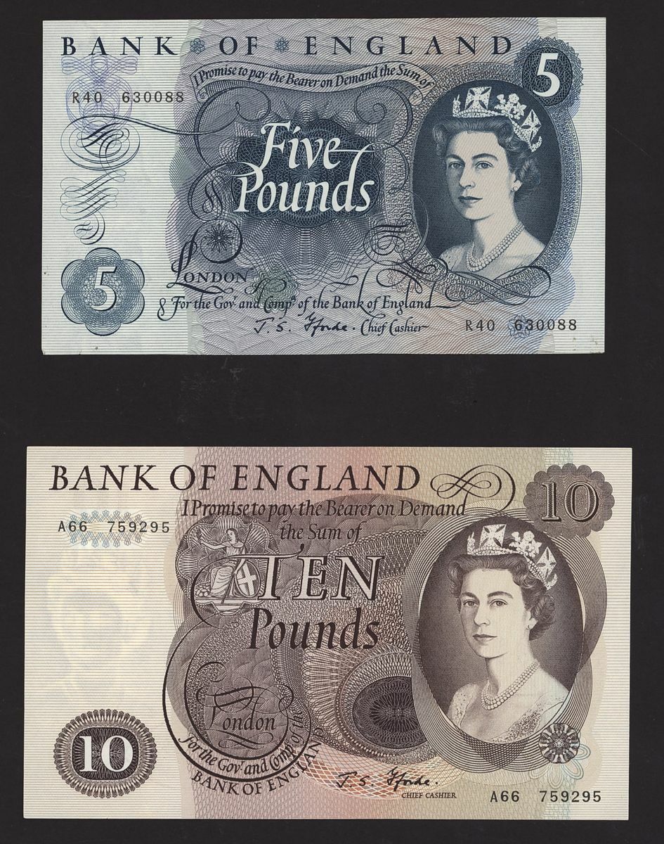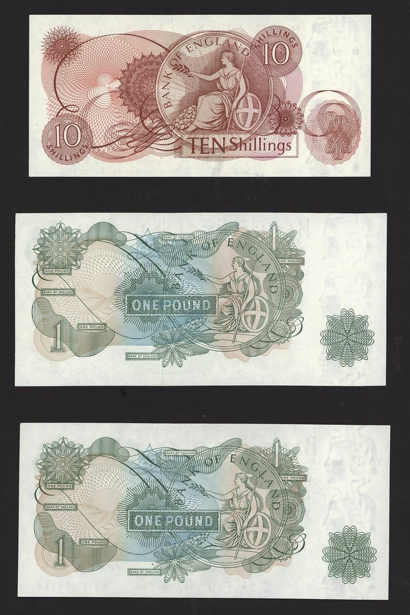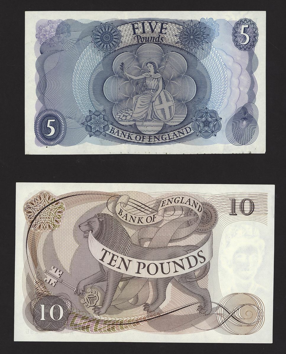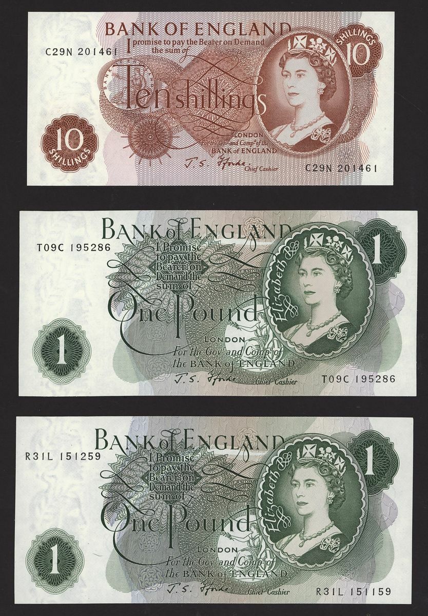 (x) Bank of England, [5 notes] 10 Shillings, £1, £5, £10, 1967, J. S. Fforde signature, (Pick 373c, 374e, 374f, 375b, 376b, EPM B310, 305, 307, 312, 316), about uncirculated to uncirculated, foxing on £5 note (5 notes)
