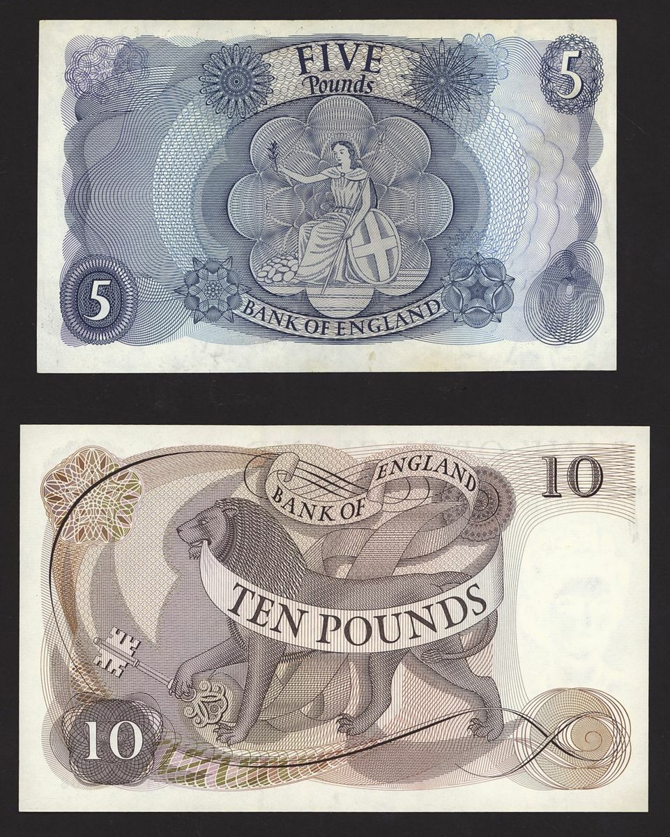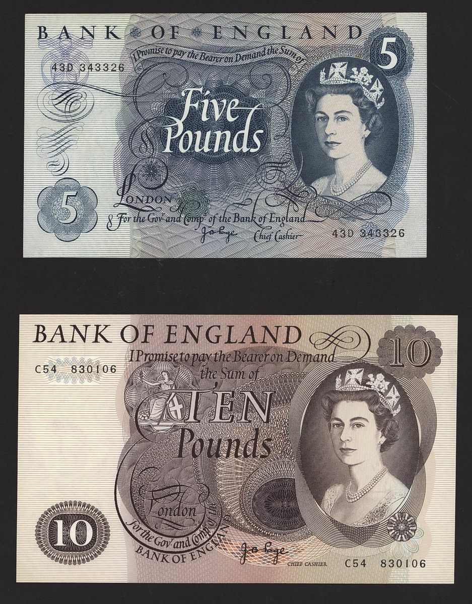 (x) Bank of England, [2 notes] £5, £10, 1970-71, J. B. Page signature, (Pick 375c, 376c, EPM B324, 326), uncirculated, counting creases, toning (2 notes)