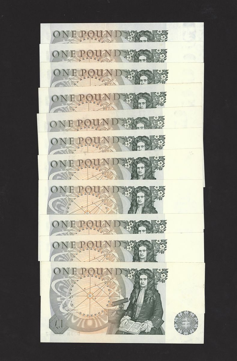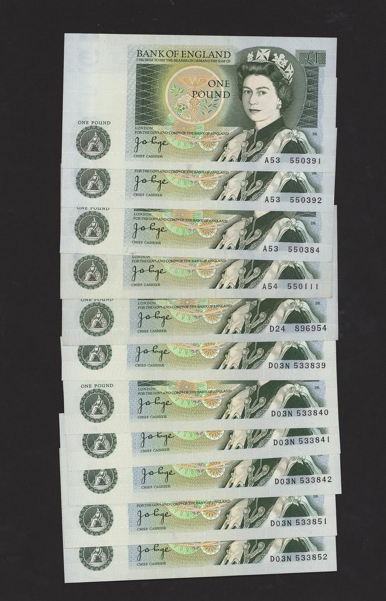 Great Britain, [11 notes] £1, ND (1978), J. B. Page signature, two pairs of consecutive serial numbers D03N 533851-2 and A53 550391-2, and run of 4 consecutive serial numbers D03N 533839-42
