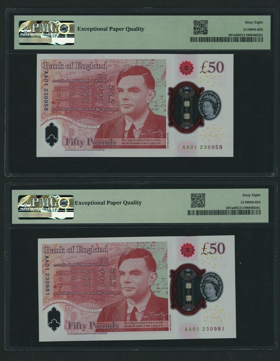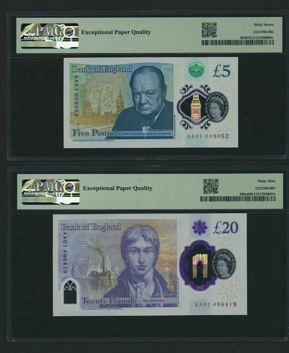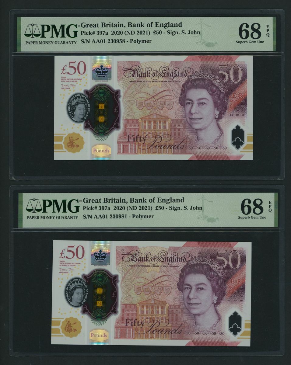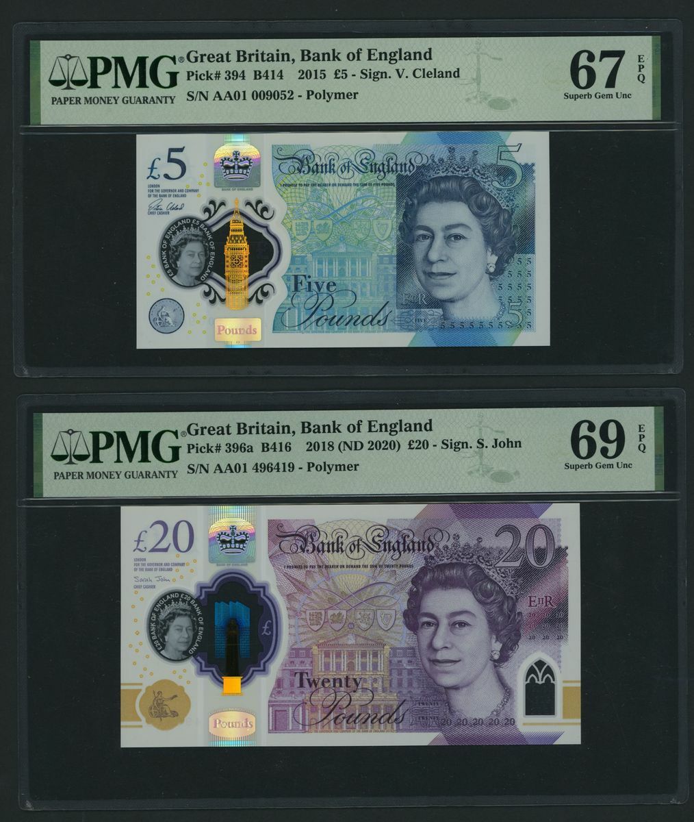 (x) Bank of England, [4 notes] £5, £20, £50, 2015-2020, (Pick 394, 396a, 397a), in PMG holders 68 EPQ Superb Gem Uncirculated to 69 EPQ Superb Gem Uncirculated (4 notes)