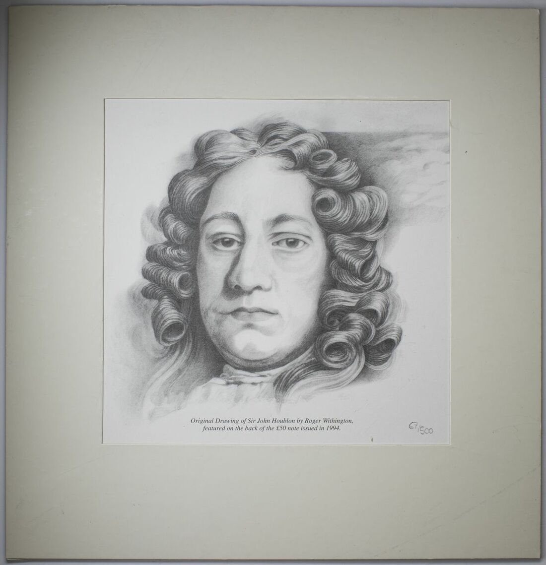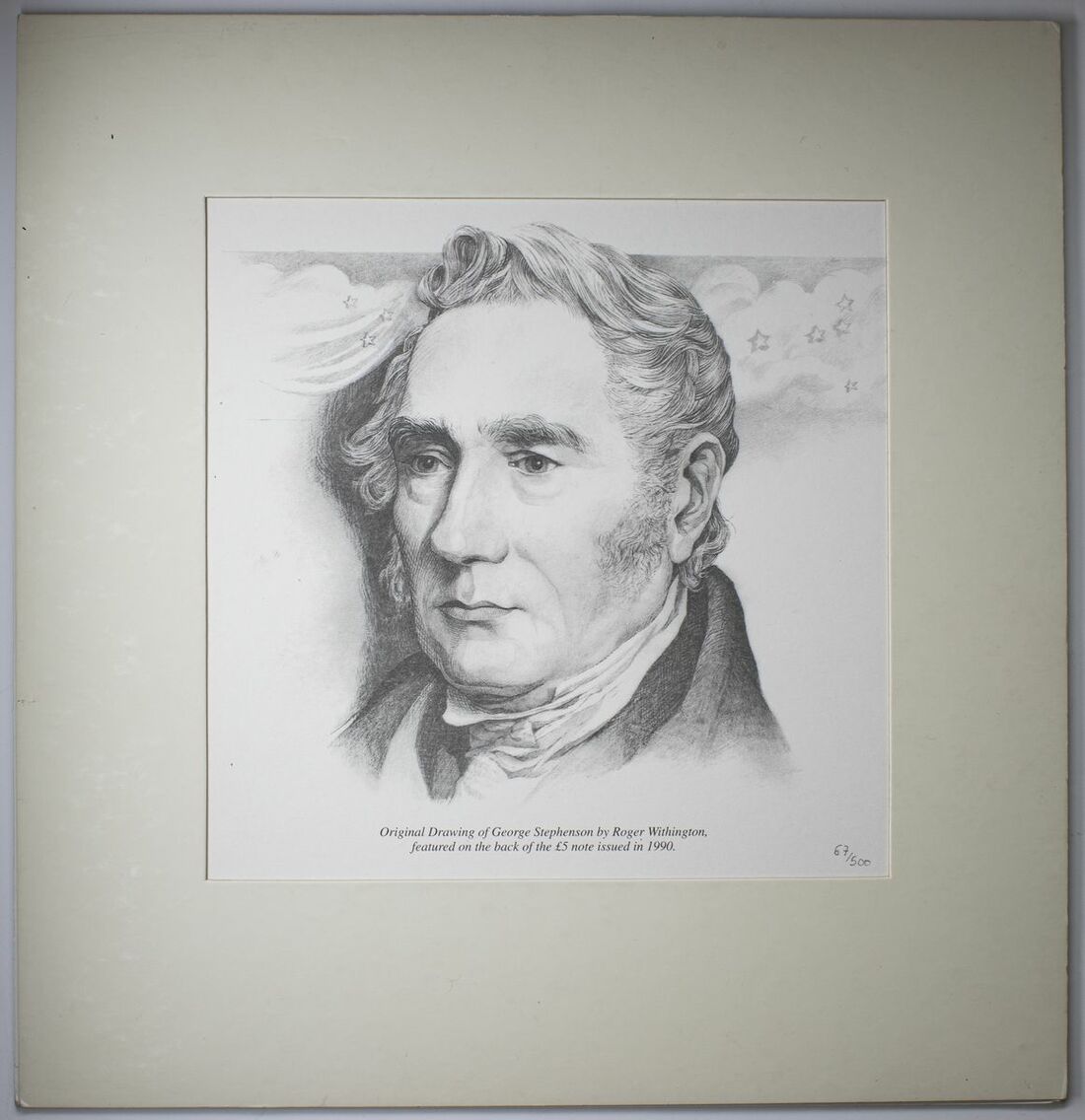 Prints, [3 pieces] original portraits by Roger Withington featured on banknotes, original drawing of George Stephenson by R. Withington featured on the reverse of the £5 note issued in 1990, number 67/500; original drawing of Michael Faraday by R. Withington featured on the reverse of the £20 note issued in 1991, number 67/500; original drawing of Sir John Houblon by R. Withington featured on the reverse of the £50 note issued in 1994, number 67/500