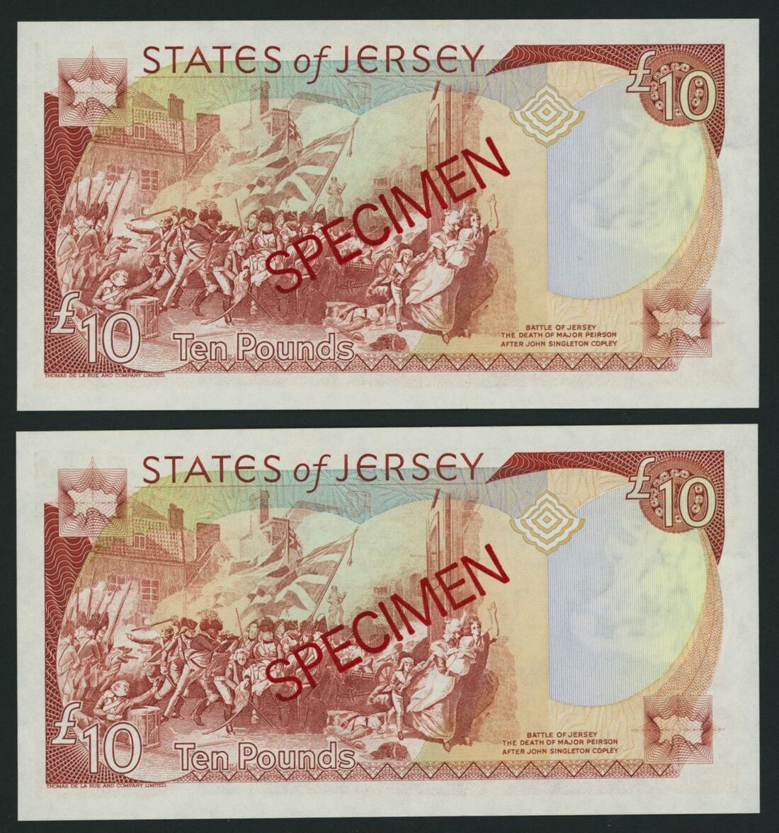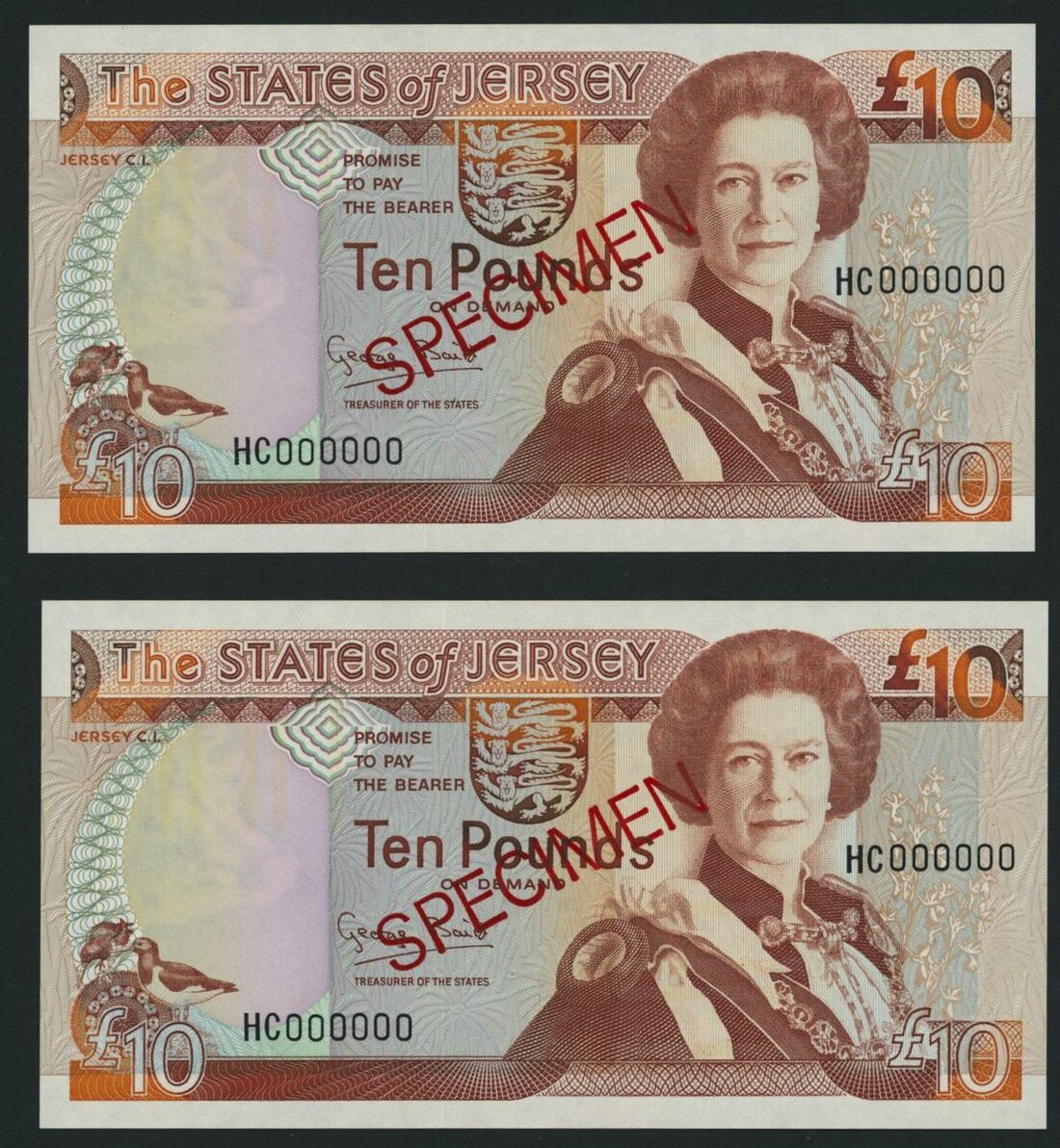 Jersey, States of Jersey, [2 notes] specimen £10, ND (1989), serial number HC 000000, (Pick 17s, BNB 117s), uncirculated (2 notes)