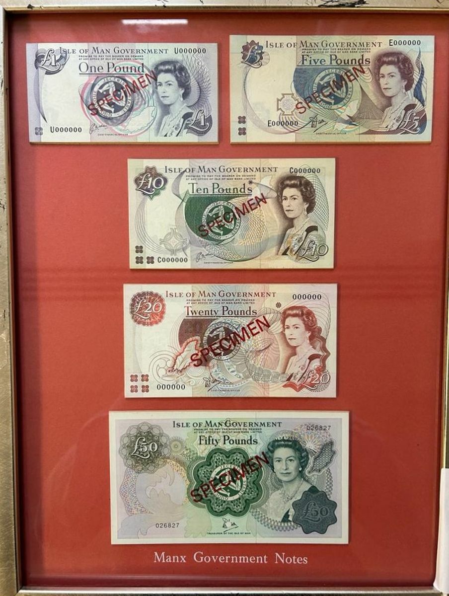 (IMPM M540a, Q547), uncirculated and all notes displayed within a professionally-constructed mount & frame, title 'MANX GOVERNMENT NOTES' at lower centre and each note separately mounted on card, unusual and interesting (5)