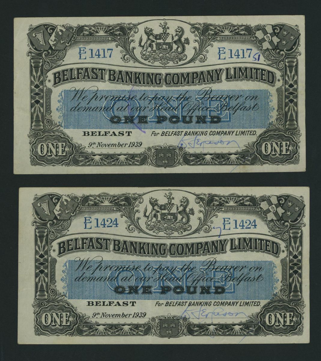(x) Northern Ireland, Belfast Banking Company, [2 notes] £1, Belfast, 9th November 1939, (Pick 126b, BB 65), extremely fine, minor graffiti on one (2 notes)