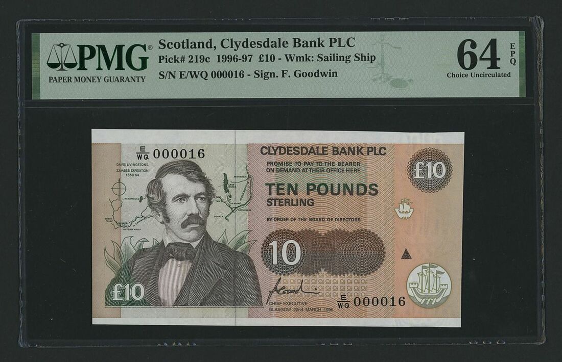 Scotland, Clydesdale Bank PLC, £10, 22nd March 1996, serial number E/WQ 000016, (Pick 219c, BNB 1152), in PMG holder 64 EPQ Choice Uncirculated
