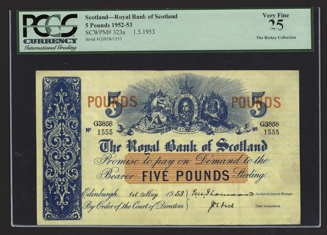 (x) Royal Bank of Scotland, £5, Edinburgh, 1st May 1953, serial number G3858/1555, (Pick 323a), in PCGS holder 25 Very Fine, from the Rickey Collection