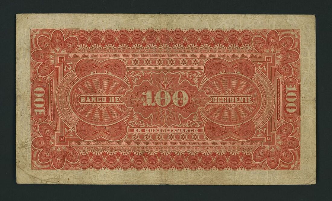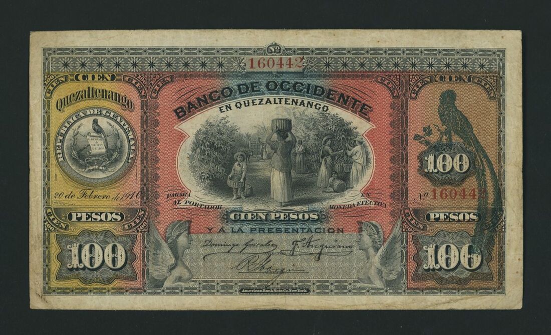 Banco de Occidente en Quezaltenango, Guatemala, 100 Pesos, 20th February 1910, serial number 160442, (Pick S182b), solid fine
