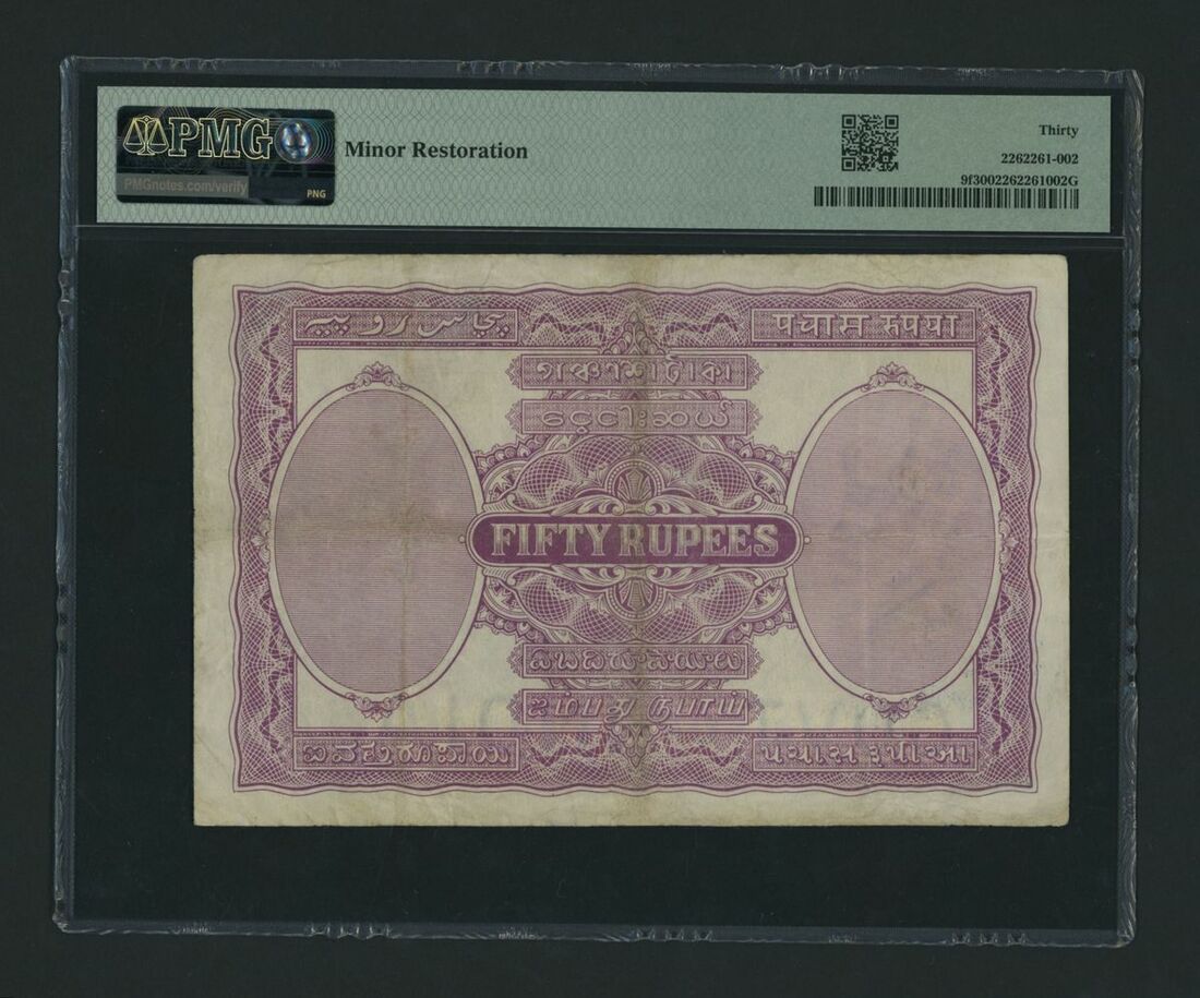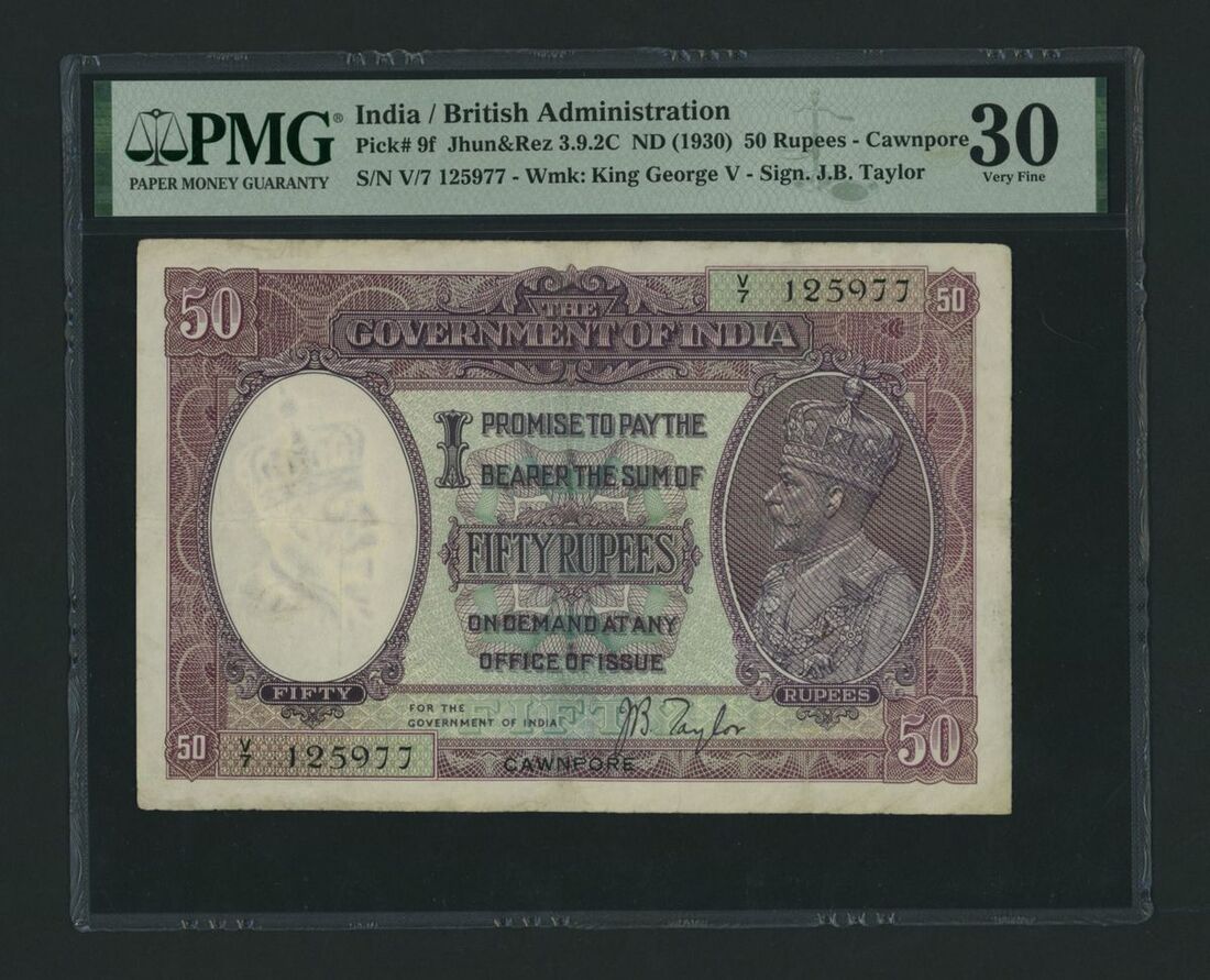 (x) Government of India, 50 Rupees, Cawnpore, ND (1930), serial number V/7 125977, (Pick 9f, Jhun&Rez 3.9.2C), in PMG holder 30 Very Fine, minor restoration, only 1 note in higher grade at PMG