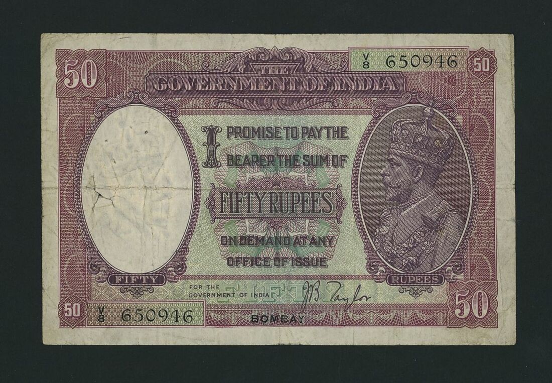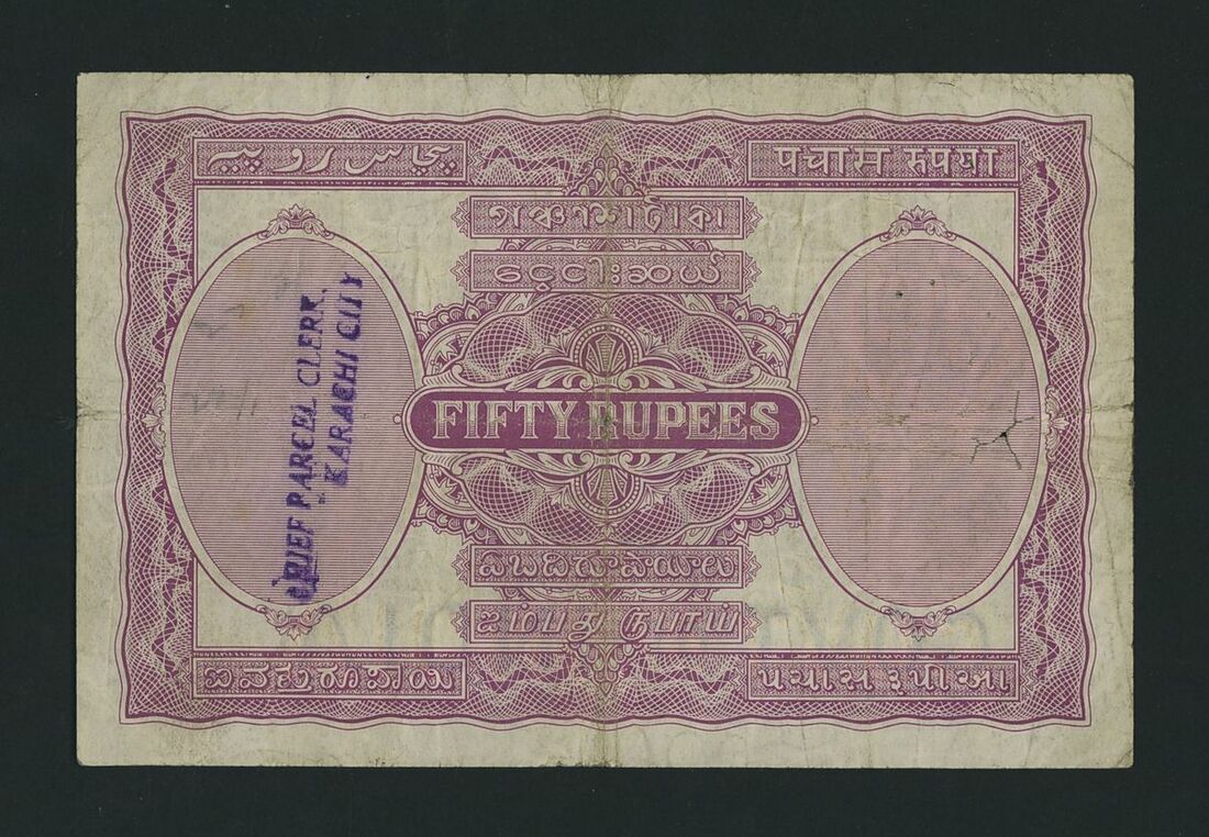 Government of India, 50 Rupees, Bombay, ND (1930), serial number V/8 650946, (Pick 9b, Jhun&Rez 3.9.2A, BNB 143b2), "Brief parcel clerk Karachi city" purple stamp on the reverse, split on the watermark, otherwise paper solid fine