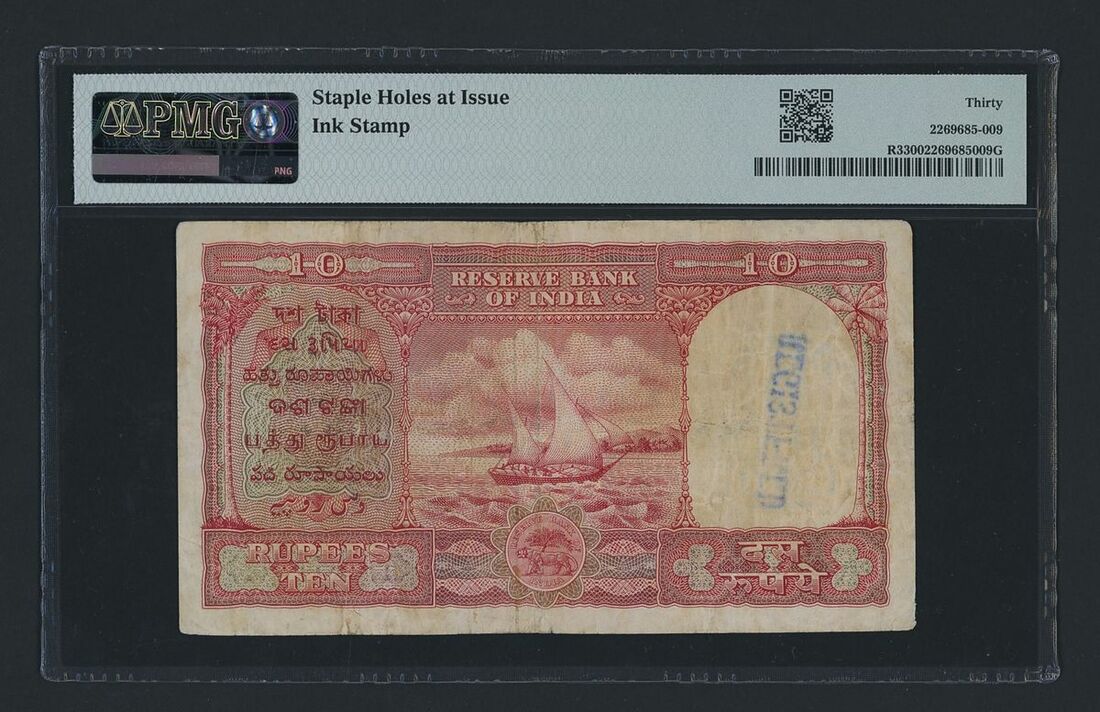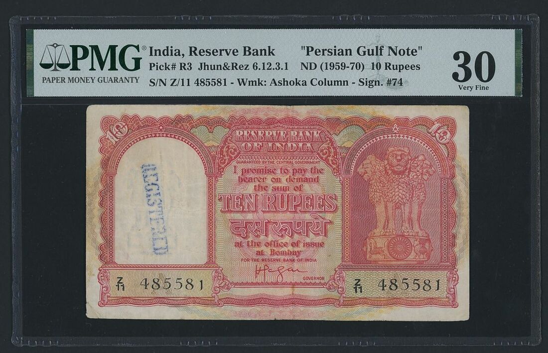 (x) Reserve Bank of India (Persian Gulf Note), 10 Rupees, ND (1959-70), serial number Z/11 485581, (Pick R3, BNB R202a, Jhun&Rez 6.12.3.1), in PMG holder 30 Very Fine, staple holes at issue, ink stamp